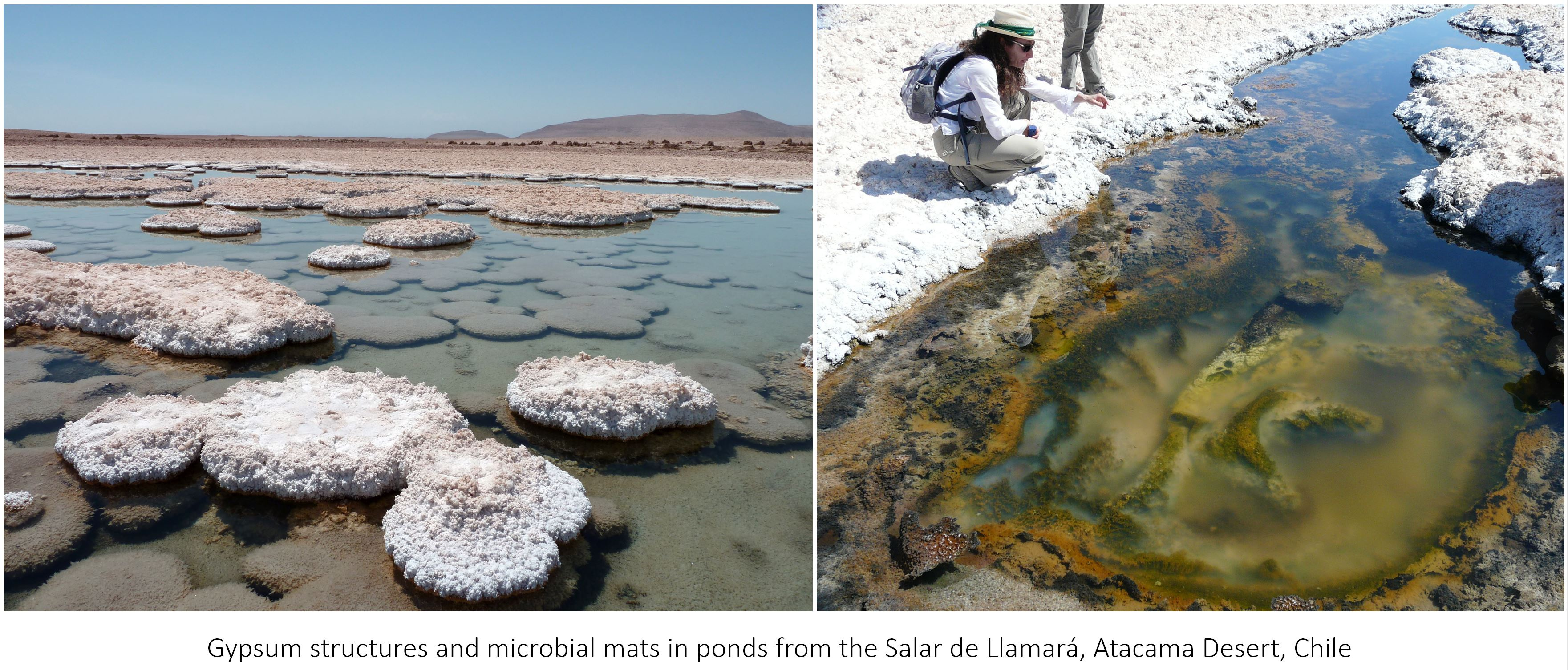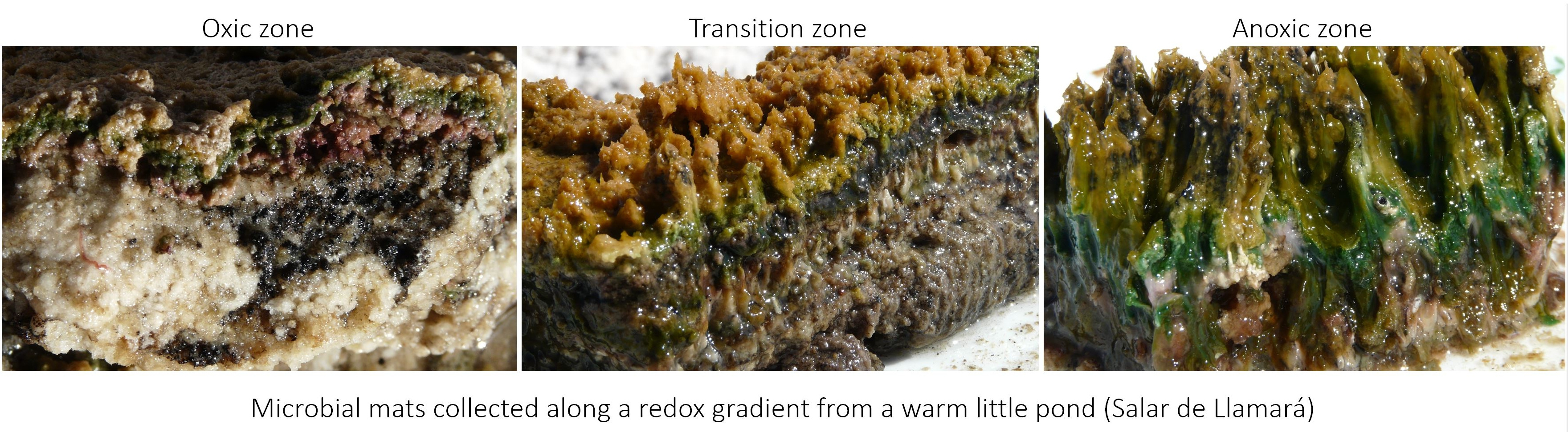 Today, thick phototrophic microbial mats are often restricted to extreme environments, such as geothermal or hypersaline areas. For our study, we collected microbial mats from one pond in the Salar de Llamará, one of the many ‘salares’ or salt flats that occur in the Atacama Desert, Chile. One of the driest deserts on the planet, Atacama also experiences high diurnal temperatures and, because of its average altitude (around 3,000 m), high ultraviolet irradiation. Shallow ponds and lakes can form in the ‘salares’ depending on the groundwater table. During our field trip, we observed many diverse small ponds at Llamará. We focused our sampling effort in one of them, which we called LLA9 and harboured colourful microbial mats.