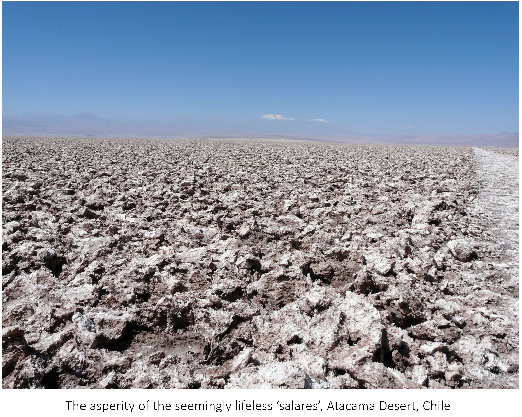 Accompanied by geologists and geochemists, we visited several ‘salares’ during that field trip. Some look so desolate that it is difficult to conceive that even extremophilic microbes can thrive below the salt crusts.