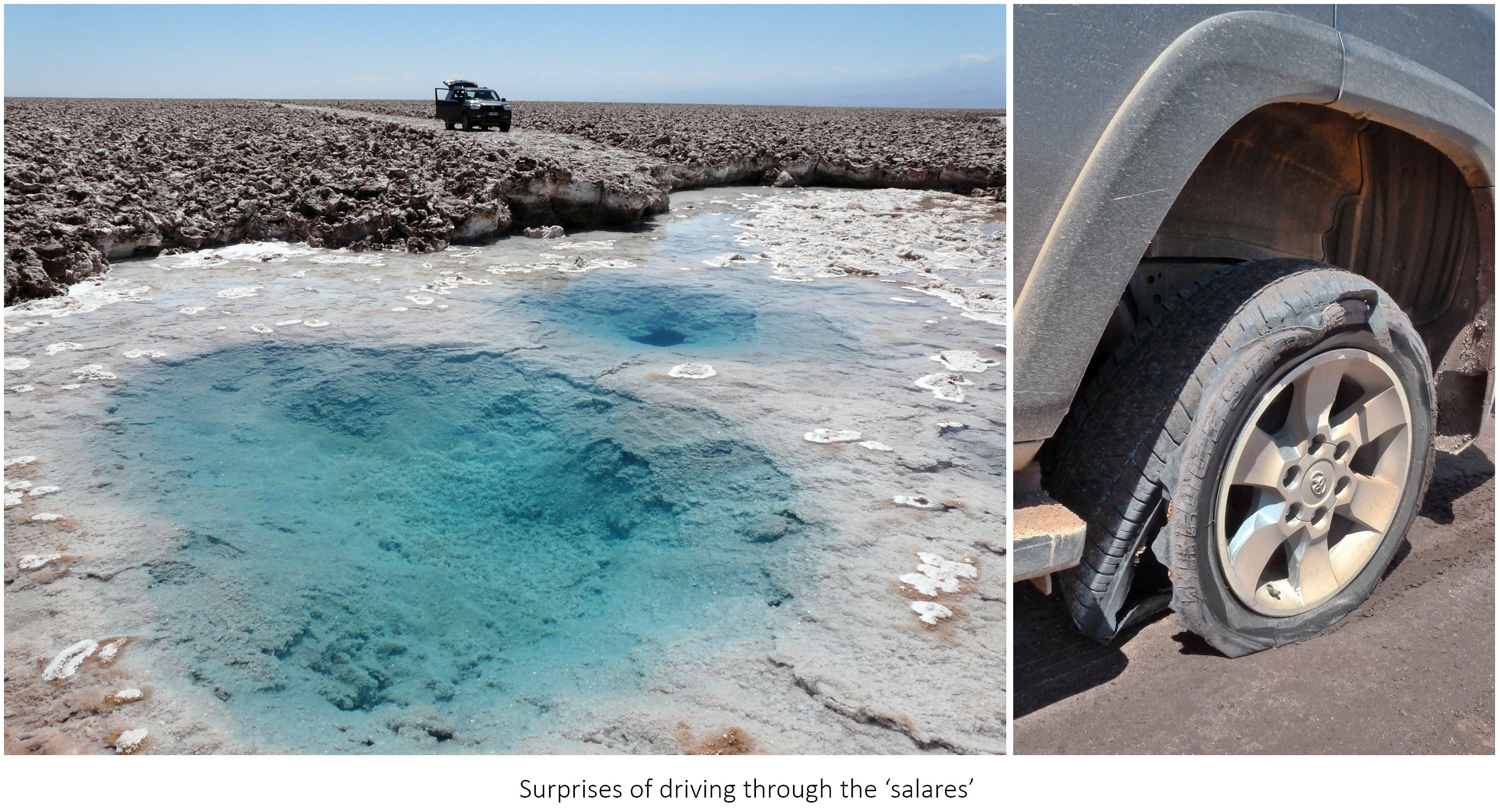 These extreme places can be treacherous. Groundwater can sometimes dissolve the salt below the ground, leading to salt pan collapse and blocking the only viable way… In some areas, salt fragments cut like broken glass… with a similar effect on tires!