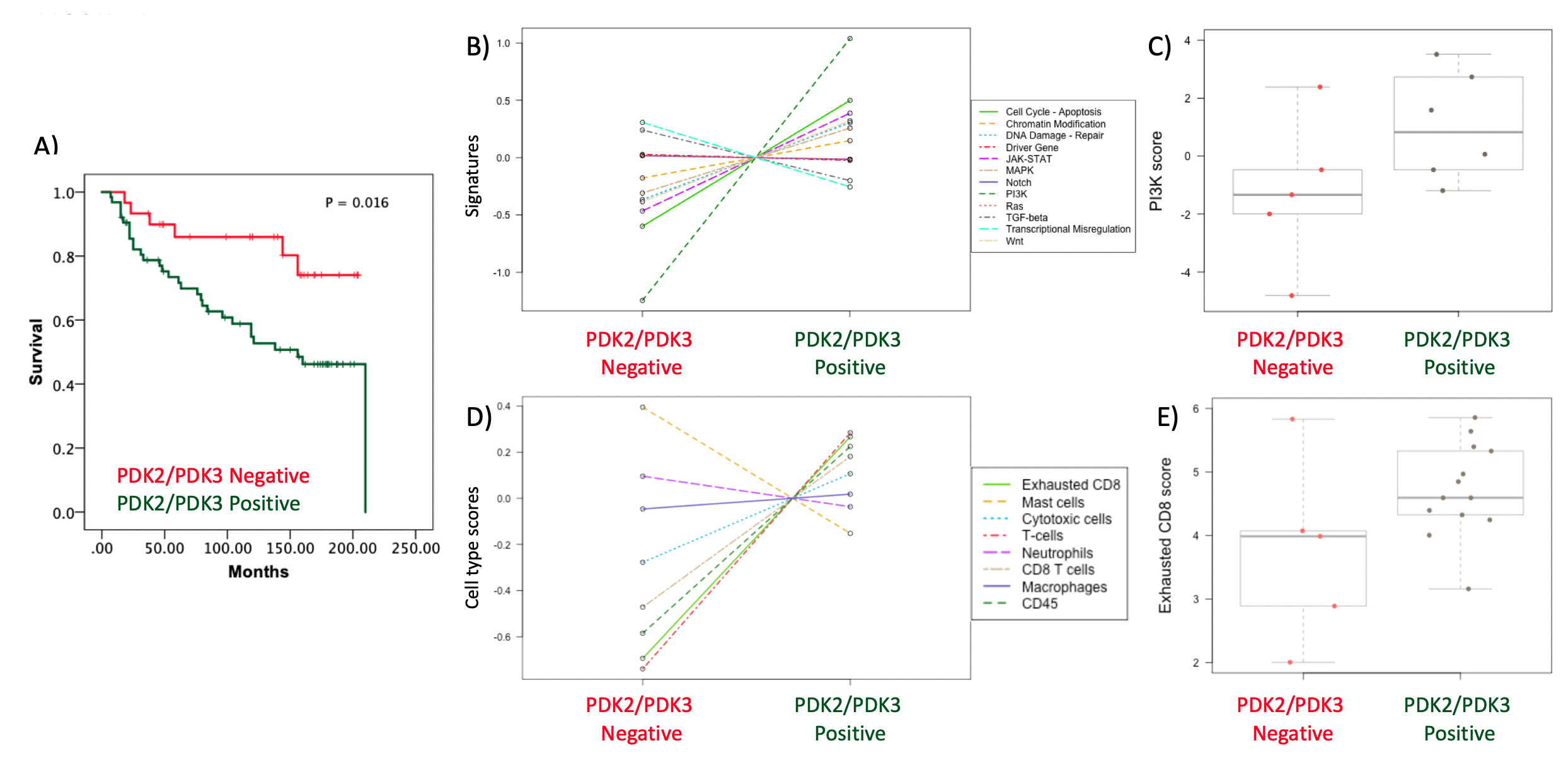 We isolated RNA from a subgroup of whole tumor tissue sections (PDK2/PDK3 positive vs. PDK2/PDK3 negative), and using nanoString technologies we analyzed gene expression profiles in pan cancer and immune exhaustion panels. Gene expression analysis revealed molecular association of PDK2 and PDK3 expression with PI3K signaling pathway, as well as with T cell infiltration and exhausted CD8 T cells (Figure 2).