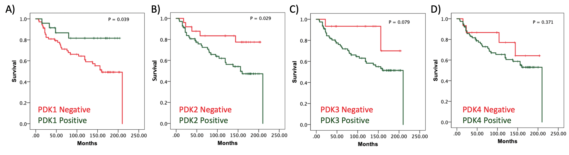 Figure 1. Kaplan-Meier survival curves of clear cell renal cell carcinoma (ccRCC) patients according to PDK1-4 tumor expression. Kaplan–Meier curves of overall survival based on PDK1 (A), PDK2 (B), PDK3(C), and PDK4 (D) protein expression in the ccRCC cohort.