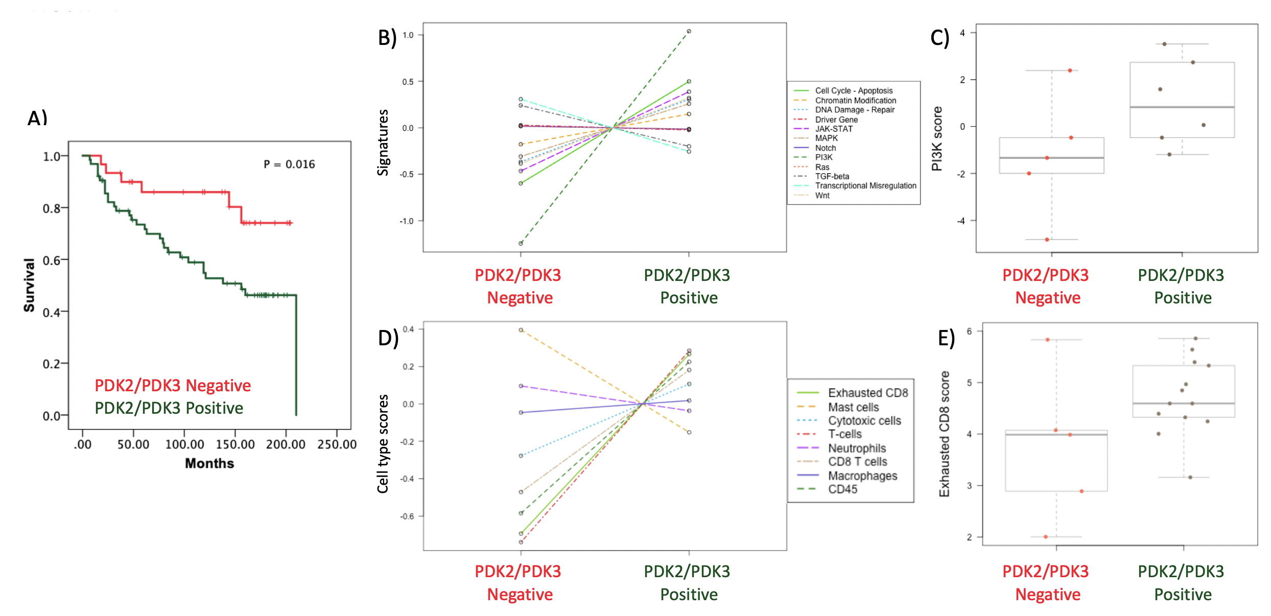 We isolated RNA from a subgroup of whole tumor tissue sections (PDK2/PDK3 positive vs. PDK2/PDK3 negative), and using nanoString technologies we analyzed gene expression profiles in pan cancer and immune exhaustion panels. Gene expression analysis revealed molecular association of PDK2 and PDK3 expression with PI3K signaling pathway, as well as with T cell infiltration and exhausted CD8 T cells (Figure 2).