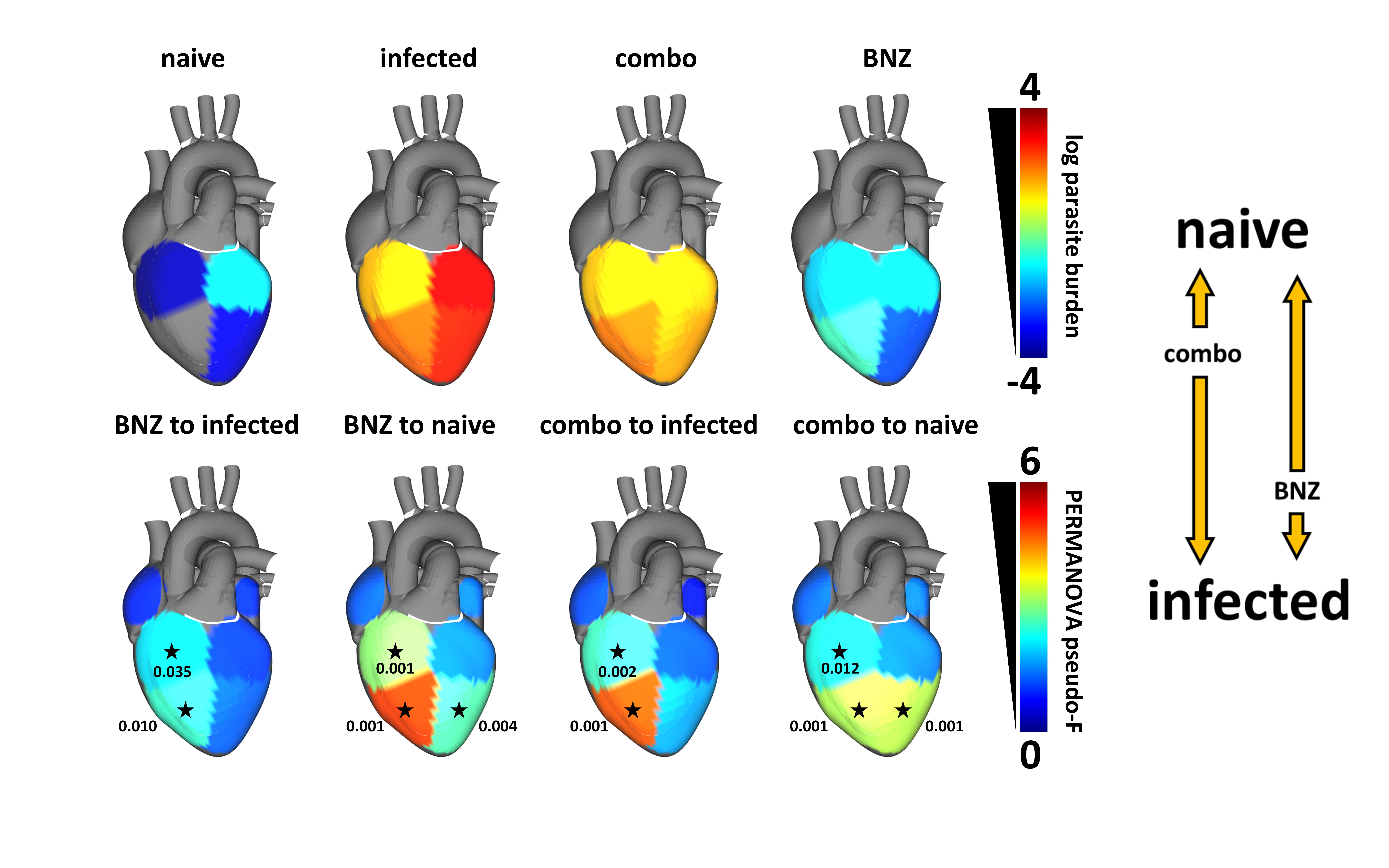 Figure 1. Superior metabolic restoration with vaccine-linked chemotherapy (“combo” treatment) than with benznidazole (BNZ), bottom and right-hand arrows, even though benznidazole is more effective at clearing parasite burden (top). Adapted from Liu et al, Nature Communications [ this paper], https://www.nature.com/articles/s41467-023-42247-w. 3D model purchased from 3DCADBrowser.com.