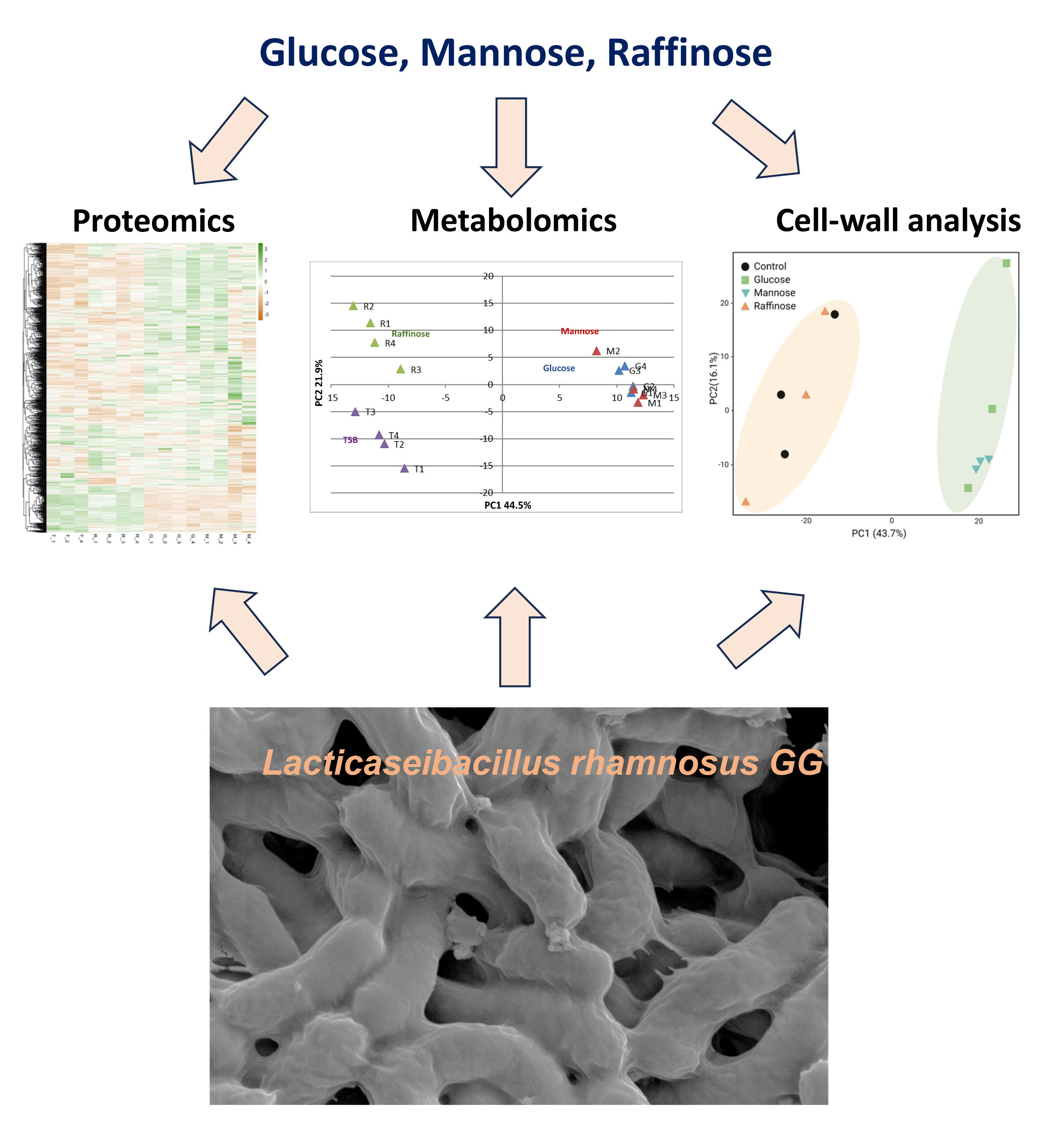 Lactobacillaceae belong to the lactic acid bacteria (LAB) group, as lactic acid is their main end-product of carbohydrate metabolism. These bacteria are Gram-positive rods. They are adapted to the low oxygen environments of humans and mammalians' gastrointestinal tract (GIT) and are facultative anaerobes. The probiotic performance in mammals' gut depends on nutrient composition and availability. Therefore, the performances of Lactobacillaceae and additional probiotic bacteria must be systematically explored and related to core metabolism. In our manuscript, we utilized metabolomic, proteomic, and volatilome (airborne metabolites) analysis (Figure 1) and in-depth microbial cell wall analysis to correlate simple carbohydrates' effect on a model probiotic bacterium Lacticaseibacillus rhamnosus GG (LGG) https://www.nature.com/articles/s41522-023-00431-2.