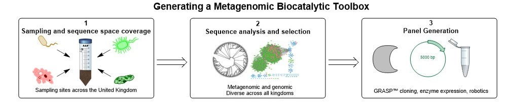 Figure 1- Generating a metagenomic biocatalytic toolbox. Several of the stages required to generate a metagenomic toolbox including the sampling of geographical locations (box 1). Sequence analysis to ensure correct dataset is obtained, including generation of sequence similarity networks (box 2). Enzyme panel generation with cloning, expression in E. coli and microtitre plate generation (box 3).