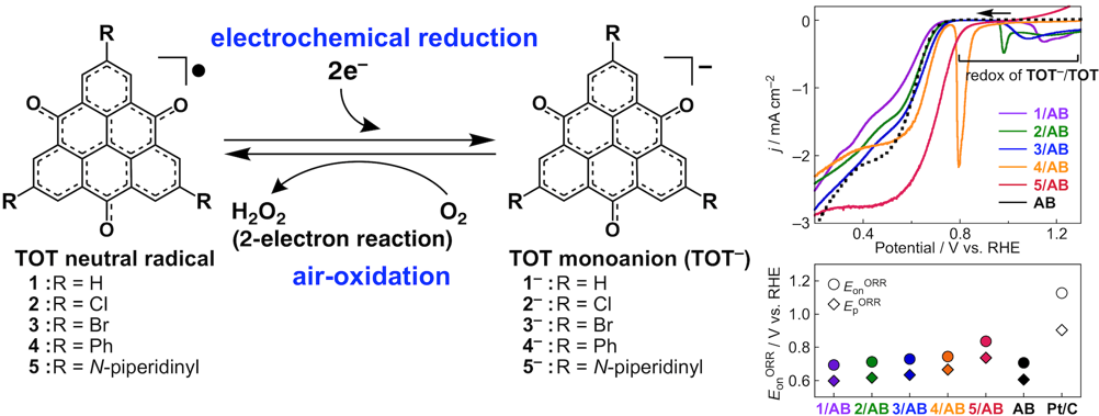The electrochemical measurements on TOT derivatives using rotating disk electrode measurements in O2 saturated alkaline aqueous solution revealed that the N-piperidinyl-substituted TOT derivative exhibited a high ORR catalytic activity with a two-electron transferring process, and the activity was higher than those of quinone derivatives and many heteroatom-doped carbon materials. We also analyzed the effect of transition metal impurity (Pd and etc) in detail, and elucidated that ~100 ppm level of contamination with Pd, which is smaller than the experimental error, has a negligible effect on the ORR catalytic activity. From the discussion of the substituent effect of TOT, we concluded that the mechanism of ORR of TOT derivatives is caused by the cooperation of electrochemical reduction and air-oxidation between neutral radical and monoanion of TOT.
