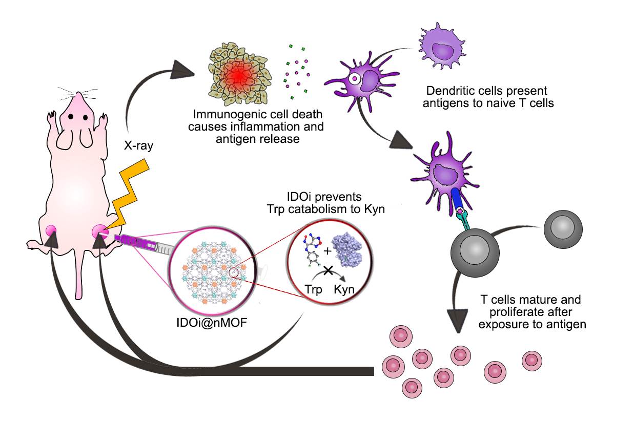 After absorbing X-ray photons, the Hf clusters can enhance RT via the production of ˑOH radicals and enable RDT by exciting the porphyrins to generate 1O2 (Fig. 1). This nMOF-enabled process eradicates several different types of cancer cells with the use of extremely low doses of X-rays both in vitro and in vivo. Interestingly, we found that RT-RDT can trigger an immune response, allowing for strong synergy with immune checkpoint inhibitors (Fig. 2). By loading a small-molecule IDO inhibitor (IDOi) into the pores/channels of the nMOFs, an unprecedented 100% abscopal response (rejecting/regressing both treated, irradiated tumours and untreated, non-irradiated tumours) was observed in syngeneic mouse models of breast and colorectal cancers.