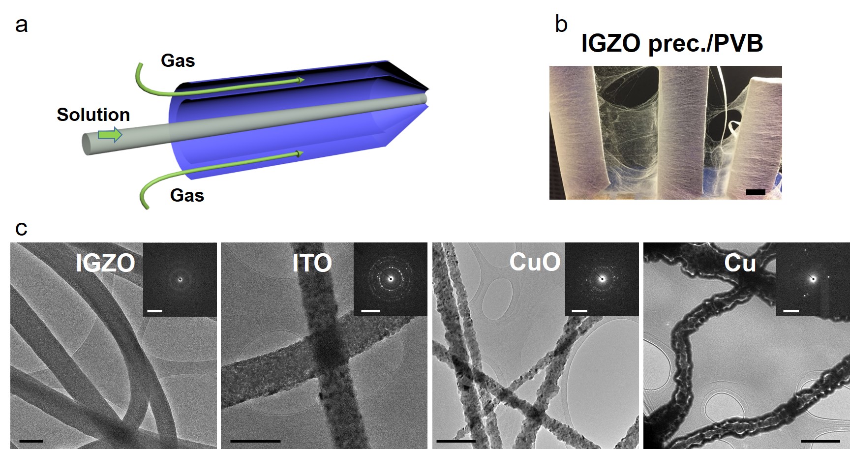 Figure 1. Schematic of the blow-spinning method. (b) Photograph of a metal salt/PVB fiber mat of IGZO fibers. Scale bar = 50 μm. (c) Transmission electron microscopy images of IGZO, ITO, CuO and Cu fibers. Scale bar = 200 nm.