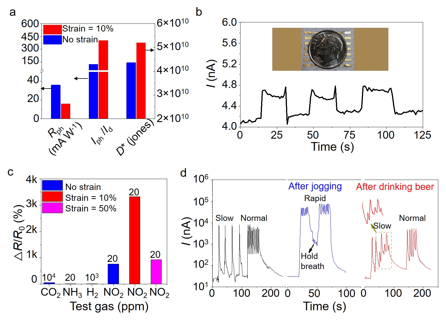 Figure 2. (a) Calculated photoresponsivity, on/off current ratio, and resistor detectivity under no strain and 10% strain of IGZO FN/SEBS devices. (b) Dynamic I-t curve of pressure sensor by loading and unloading a dime covered by a piece of tape. Inset: schematic of a dime on CuO FN/SEBS pressure sensor. (c) Relative resistance changes of IGZO FN/SEBS sensor exposed to 20 ppm NH3, 20 ppm NO2, 1000 ppm H2, and 10000 ppm CO2. (d) Current change of a wearable resistor exposed to exhaled gas during respiration. Inset: enlarged I-t curves for slow breath rate after drinking alcohol.