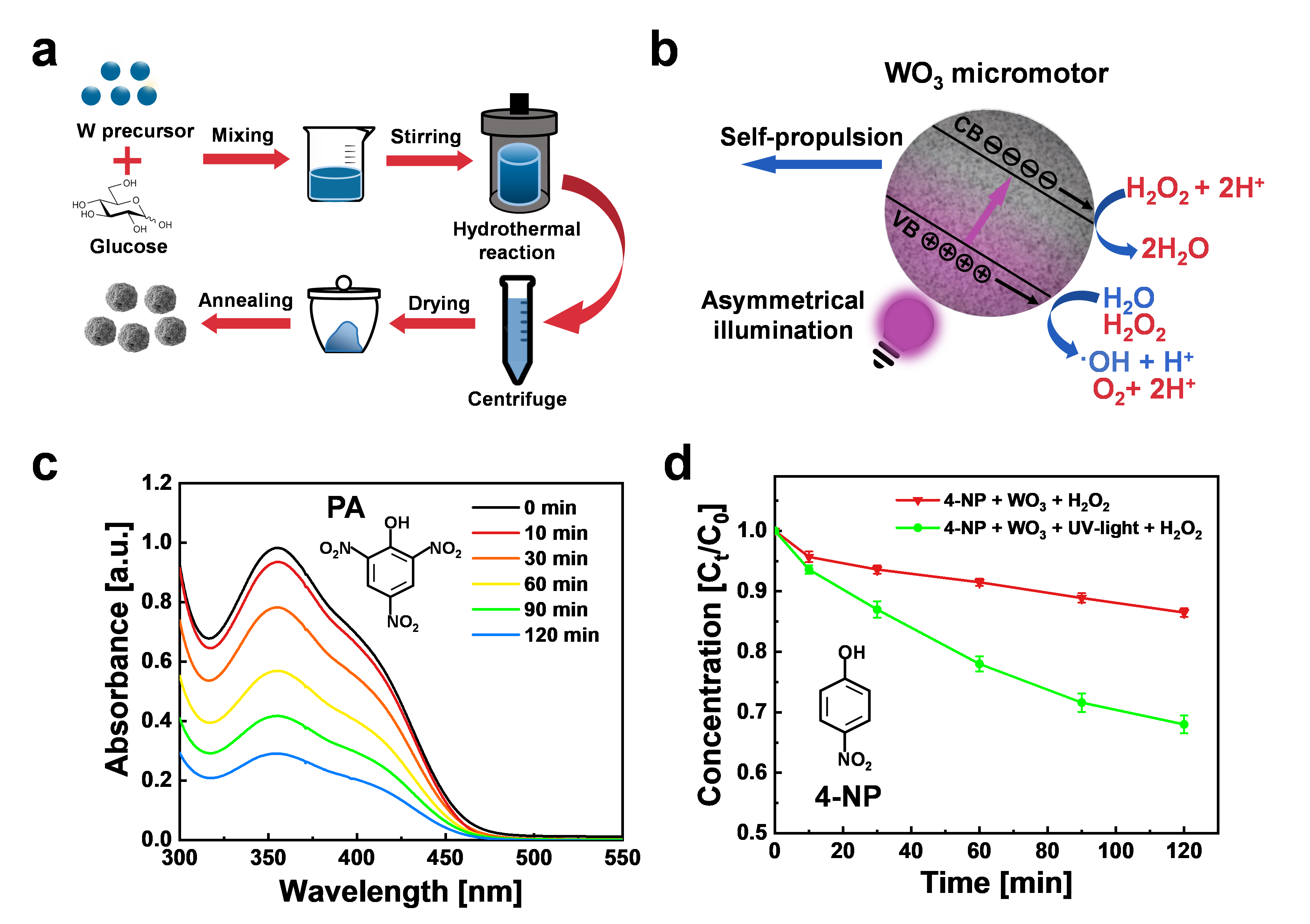 In this study, we demonstrate a facile strategy for degrading nitroaromatic pollutants using single-component WO3 microrobots that do not require additional noble-metal coating (Fig.1). The WO3 microrobots were prepared using a simple hydrothermal reaction followed by a calcination process, making them low-cost and easy to produce. Once exposed to asymmetric light illumination, the microrobots can self-actuate in pure water without the need for fuel. This remote control and rapid response over on/off switching of UV light allows for precise control of the microrobots' motion. In addition, the addition of H2O2 enhanced the motion and diffusion of the microrobots, making them even more effective in degrading nitroaromatic compounds.