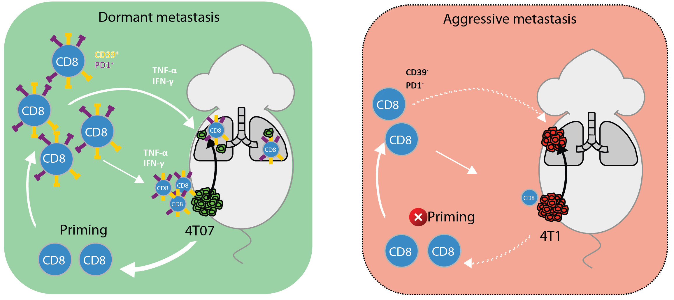 We further explored the mechanism of this metastatic dormancy and discovered that it was dependent on the anti-tumor immunity generated by the primary tumor. This anti-tumor immunity was mediated by CD8+ T cells since their depletion or absence in genetic models allowed 4T07 cells to become metastatic. To further identify the CD8+ subset that mediated metastatic dormancy we analyzed the immune infiltrate in the 4T07 model. We discovered that 4T07 primary tumors and lungs were enriched in CD39+ PD-1+ CD8+ T cells. This population was enriched in effector and exhaustion markers.