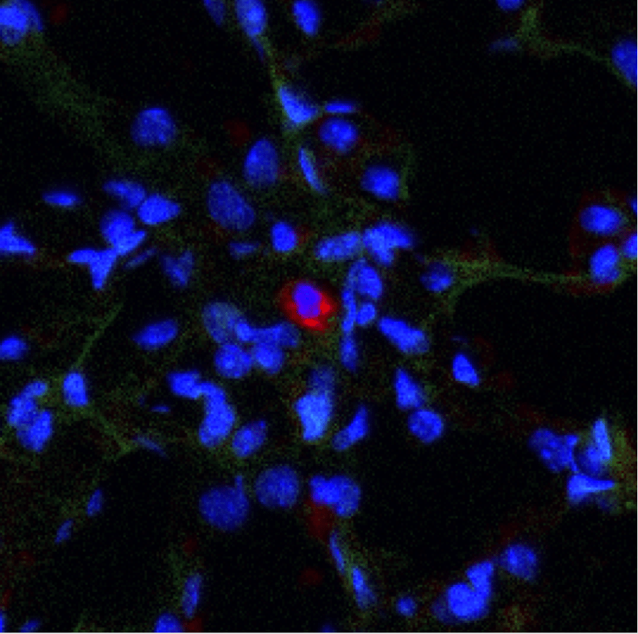 Dormant disseminated breast cancer cell in the lungs of 4T07 primary tumor-bearing mice by Héctor Castañón