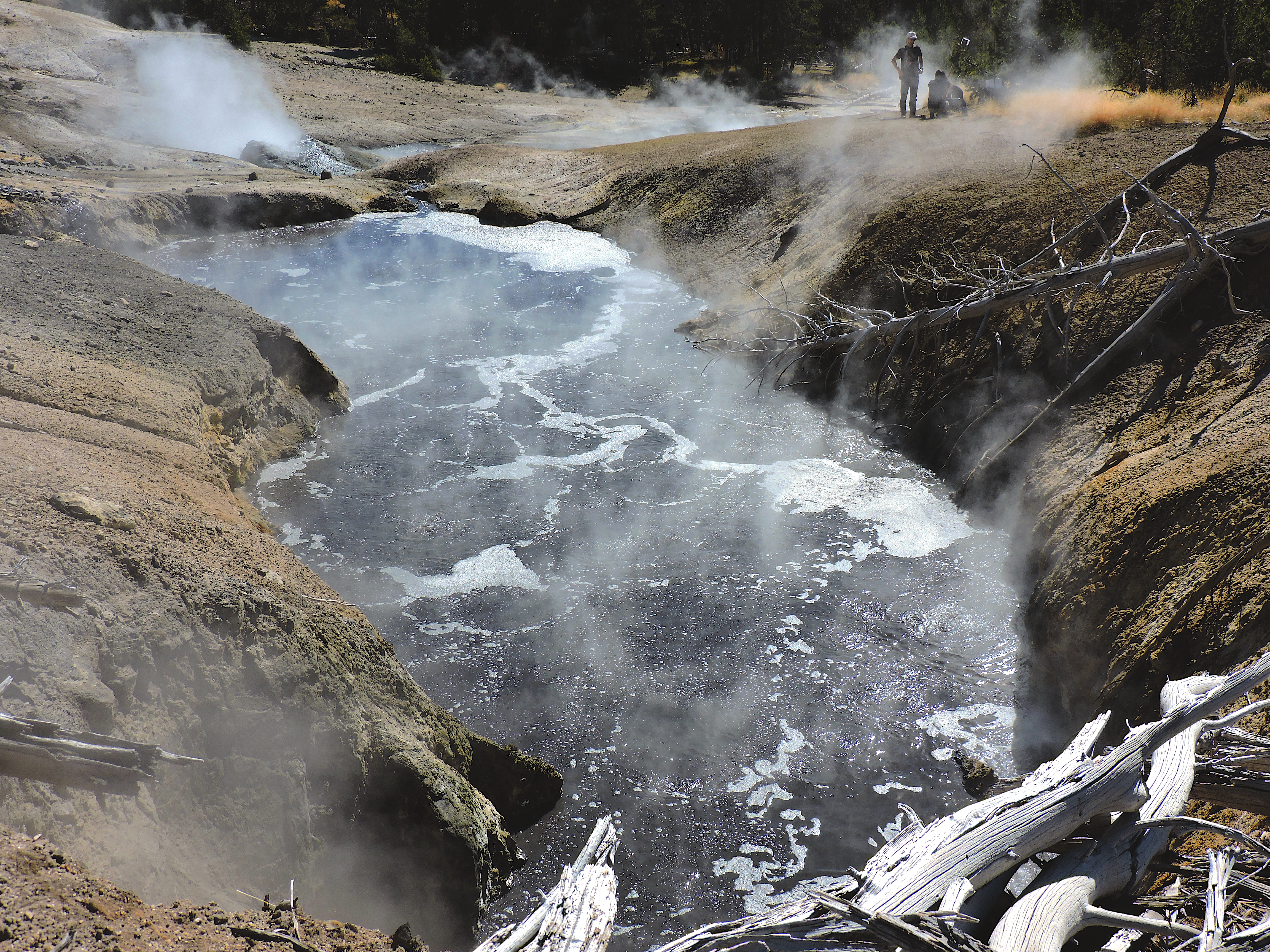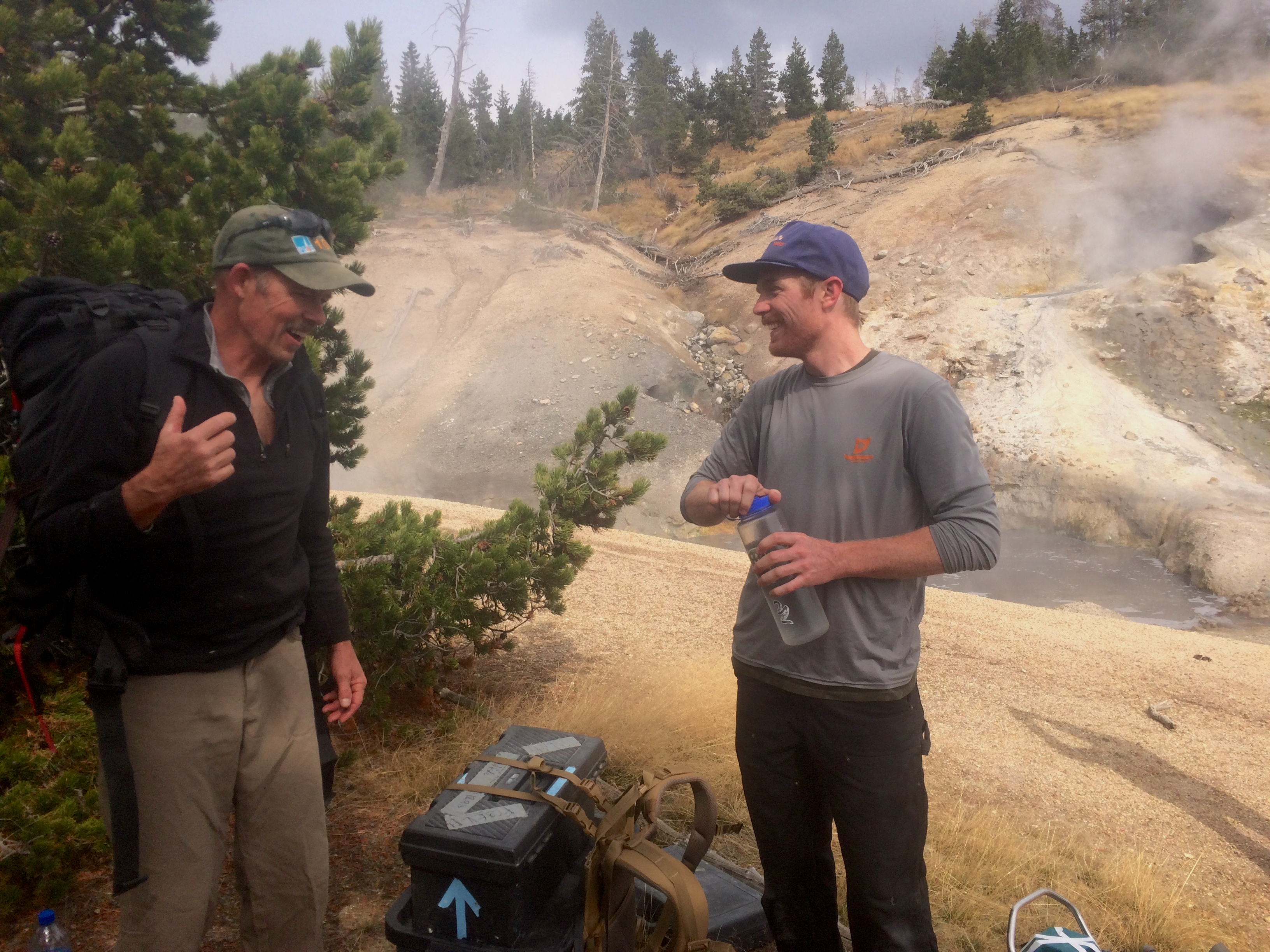 Five miles into the backcountry of Yellowstone National Park, you can smell Washburn Hot Springs before you see it. Unlike other natural wonders, Washburn is sparsely visited and lends itself to the sense of discovery that was surely felt by those who first wandered upon it. On this trip our research team is loaded to the brim with gear for sampling the sulfidic environment, wearing backpacks stacked on backpacks, carrying a dewar of liquid nitrogen, a large beaker attached to a painter’s pole, a cooler of dry ice, and a couple of toolboxes containing odds and ends that you always end up needing. Each of us is equipped with pepper spray for grizzly bears, a reminder that Nature often guards its most extraordinary treasures.