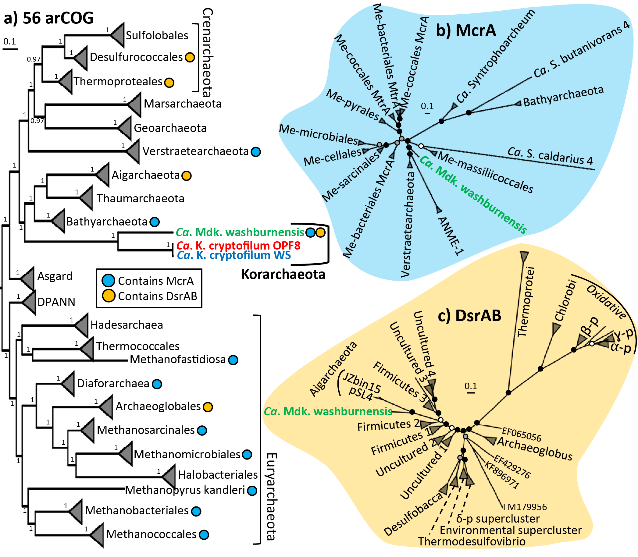 Over the past four years, metagenomic discoveries have drastically shifted our understanding of microbial methane metabolism. Genes for methanogenesis have now been discovered in several diverse archaeal lineages (Evans et al., 2015; Vanwonterghem et al., 2016; McKay et al., 2019; Borrel et al., 2019), and were shown to be involved in butane oxidation by ‘Candidatus Syntrophoarchaeum’ (Laso-Perez et al., 2016). The first thing we noticed upon examining the metagenome from Washburn Hot Springs (sample retrieved by Drs. Zack Jay, Jake Beam, and William Inskeep) was the prevalence of “non-traditional” methane-metabolizing organisms. We recovered marker genes for methanogenesis in four different archaeal genomes, and none belonged to canonical methanogenic lineages from the Euryarchaeota. Two belonged to the recently discovered phylum Verstraetearchaeota (Vanwonterghem et al., 2016; Borrel et al., 2019), one to the Hadesarchaea (Baker et al., 2016), and one to the Korarchaeota (McKay et al., 2019; Borrel et al., 2019). This observation corroborated our previous amplicon-based study of novel methyl coenzyme M reductase variants from the same hot spring (McKay et al., 2017).