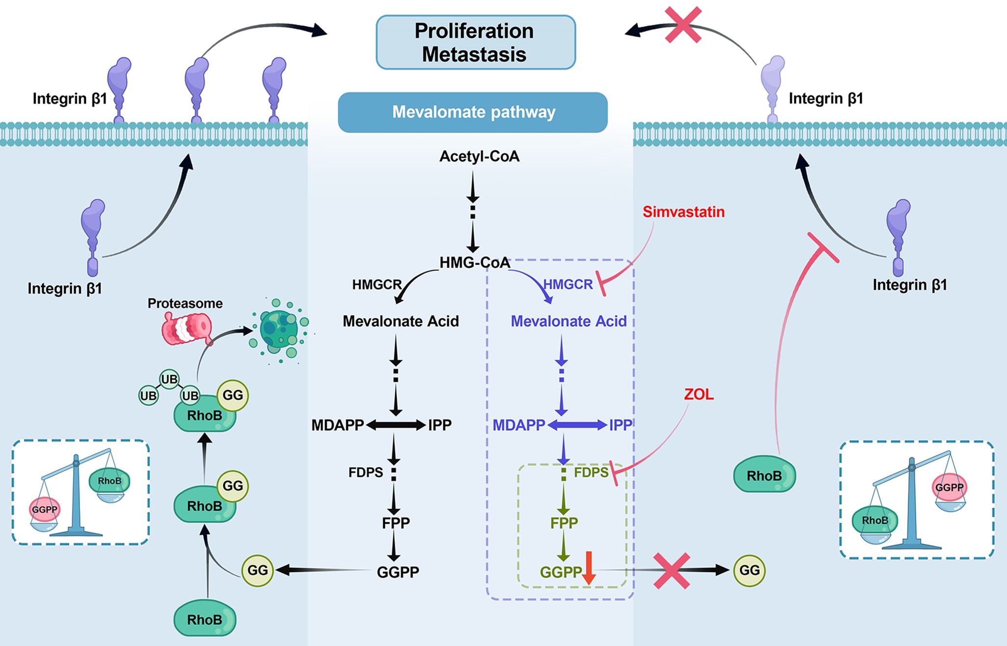 Mevalonate pathway inhibition reduces bladder cancer metastasis by modulating RhoB protein stability and integrin β1 localization