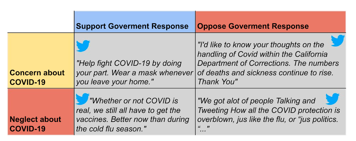 Figure 1: Examples showing different stances on social media reacting to the pandemic and government regulations.