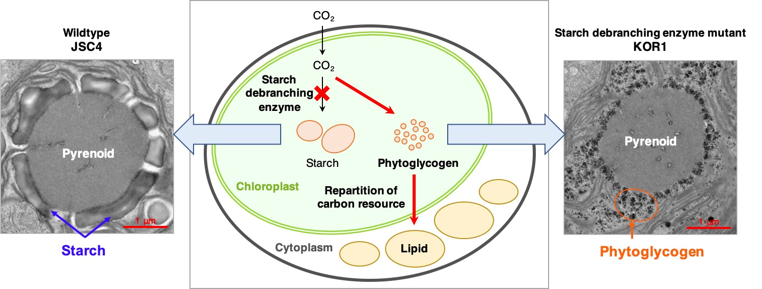 To search for more clues into the lipid accumulation, we performed transmission electron microscope (TEM) analysis. As predicted, no starch granules were observed in KOR1. Yet, when looking at the TEM images of KOR1 cells carefully, we found many small particles that resemble cyanobacterial glycogen granules. Furthermore, we found KOR1 carries significant mutations in an isoamylase-type starch debranching enzyme (DBE) gene, whose deficiency in plants was reported to cause structural changes in insoluble starch into a highly branched and water-soluble polysaccharide, called phytoglycogen. In addition, a striking fluctuation in KOR1 carbohydrate content was observed in response to light/dark cycles, suggesting enhanced carbohydrate turnover in KOR1. These facts led us to the idea that, through enhanced repartitioning of carbon resource from carbohydrate, disruption of DBE promotes lipid accumulation during light/dark cycling. These findings are reported in our recent paper published in Communications Biology4. See details in https://www.nature.com/articles/s42003-021-01976-8.