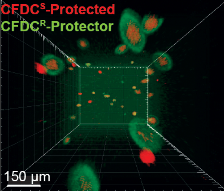 The DNA variations that promote antibiotic resistance can impose growth disadvantages in antibiotic-free environments. We demonstrated that in drug-free conditions, cefiderocol resistant bacteria revert to a cefiderocol-susceptible state, and cefiderocol resistant populations are outcompeted by the ancestral susceptible strain, indicating that evolved cefiderocol resistance pays a fitness cost. On the other hand, we expected that under cefiderocol pressure, resistant individuals would outcompete the susceptible ones. Surprisingly, we identified cefiderocol resistant bacteria that cross-protected susceptible sibling bacteria, where cefiderocol-resistant evolved bacteria grew in the outermost layers of mixed aggregates, shielding the cefiderocol-susceptible ancestral bacteria from antibiotic killing (Fig 1).