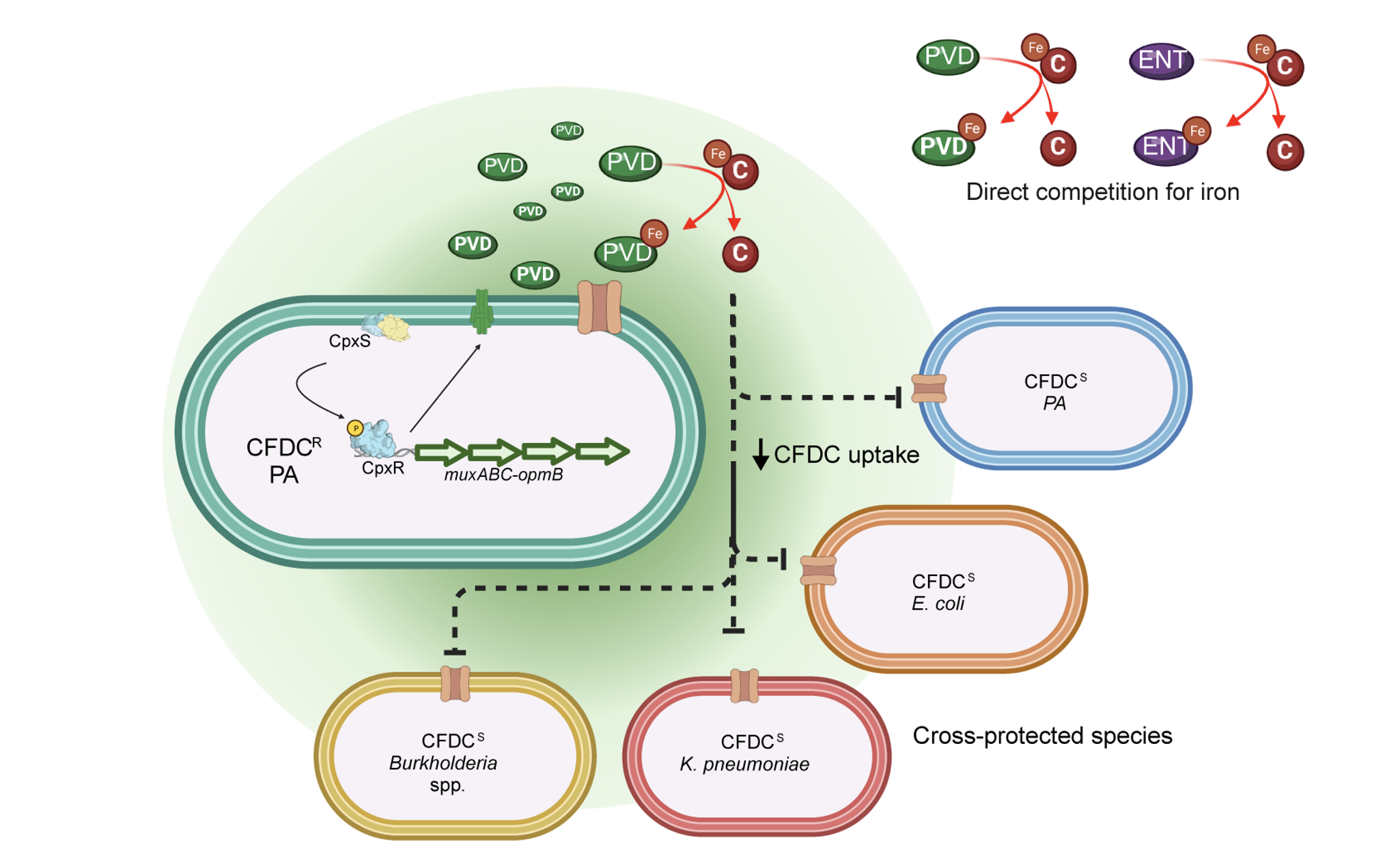 Figure 2- Pyoverdine drives cefiderocol cross-protection. Cefiderocol must be in its ferric form to be transported inside bacterial cells. Pyoverdine siderophore secreted by P. aeruginosa with high affinity for iron. We showed that cefiderocol selects for variants with increased pyoverdine secretion. The secretion of pyoverdine can directly steal iron from cefiderocol, which limits its uptake by bacterial cells, allowing susceptible neighbors to grow in a antibiotic concentration that would be otherwise lethal.