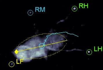 We found that female axenic (germ-free) flies exhibited heightened levels of locomotion compared to conventional females. To evaluate if these behavioral differences were due to a general feature of the gut microbiota or specific to particular species, we mono-associated axenic flies with one of three strains of bacteria found in laboratory flies, which we received from Won-Jae Lee’s lab at Seoul National University. We found that flies associated with Lactobacillus brevis, but not L. plantarum or Acetobacter pomorum, had average walking speeds similar to that found in our conventional flies. Due to these changes in locomotion, we transported our flies to Columbia University where our collaborators in the Marka laboratory helped us analyze changes in gait as modulated by the microbiome (example image below).