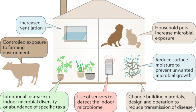 Finally, we also consider the implications of this research, specifically, how it is changing the types of materials we use in buildings, how we clean and manage our spaces, and how we understand human health in relation to our built environments. Although many studies have contributed to cataloguing microbial species that can be found in built environments, there has been a recent shift towards investigating the translational potential, as well as creating more fundamental knowledge on how microorganisms biochemically adapt to the resources available in human-made spaces and the impact on their evolution.