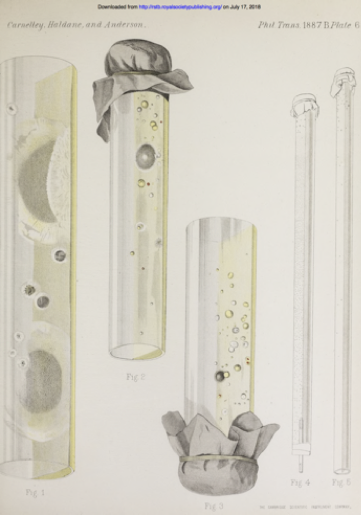 I am always drawn back to a landmark study from 1887, which James Scott at the University of Toronto first turned me on to: “The carbonic acid, organic matter, and micro-organisms air, more especially of dwellings and schools,” by Thomas Carnelley and colleagues. It’s a simple and elegant study that investigated the relationship between over-crowding, occupant activity, ventilation, and airborne concentrations of microorganisms, carbonic acid (a surrogate for CO2), and organic matter (a surrogate for organic particulate matter). They collected microorganisms by pulling air through a glass tube layered with a nutrient solution of ‘meat juice,’ peptone, salt, gelatin, and water (mmm yummy…), incubating what was collected on the jelly, and conducting visual counts of the colonies that grew (see below). We are still studying similar outcomes and relationships today.
