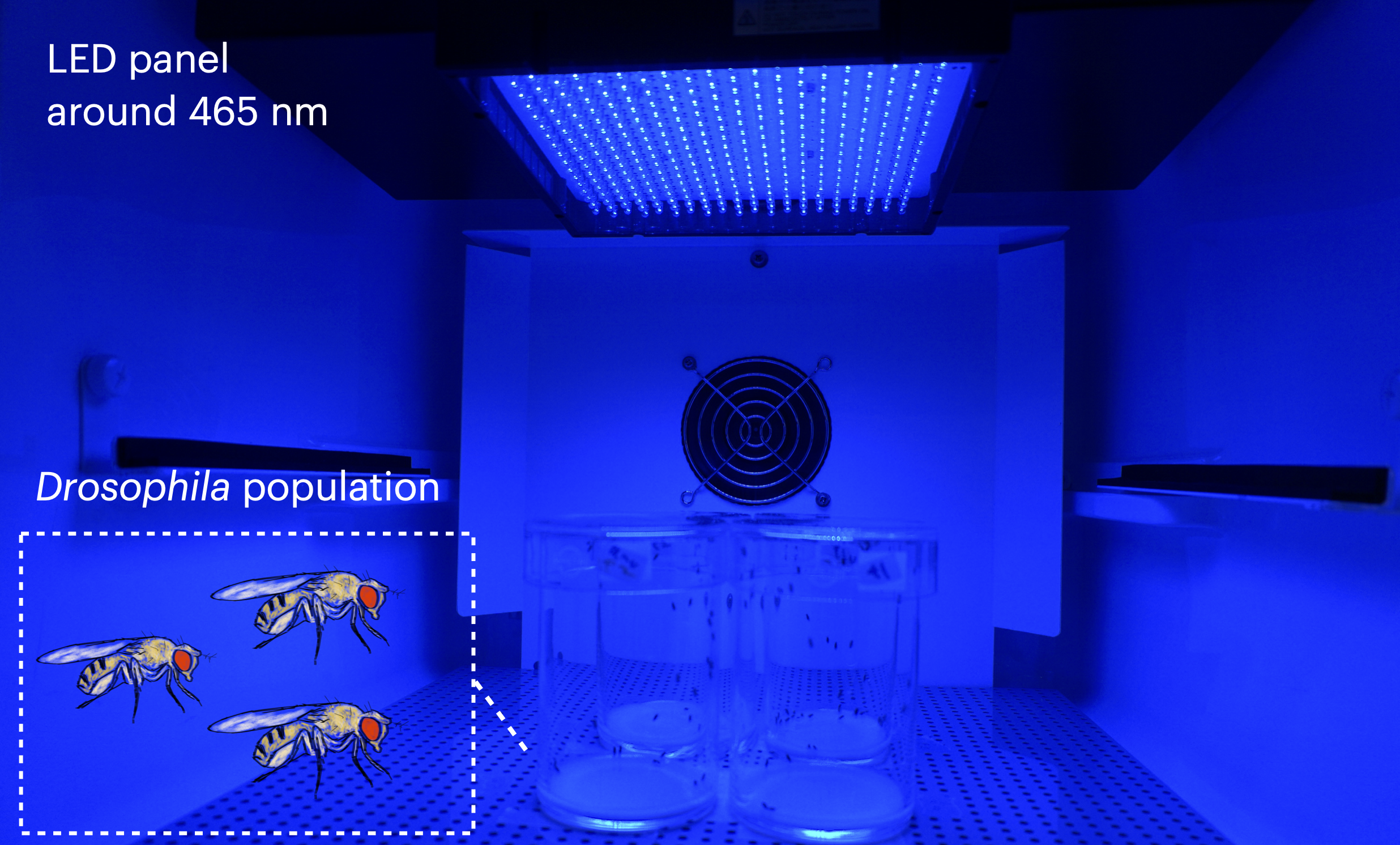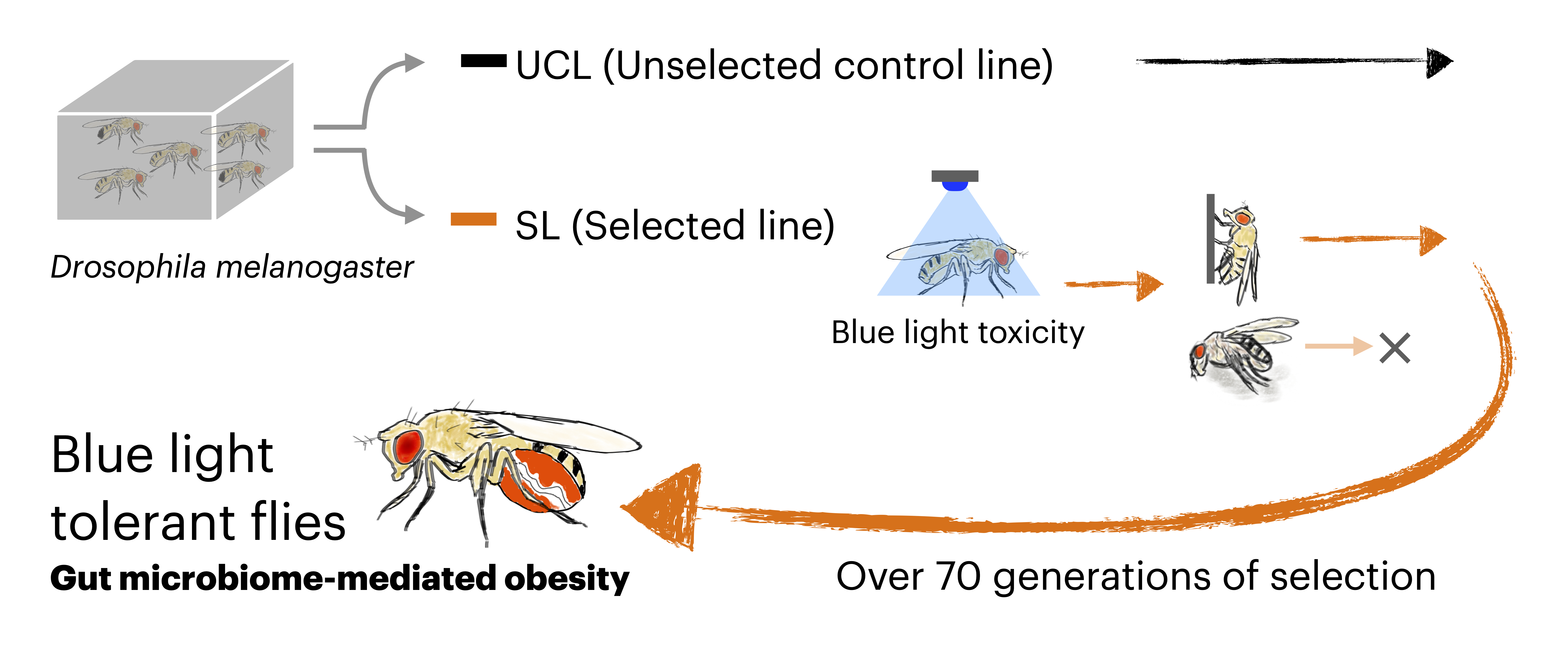 To investigate the evolutionary response to this toxicity, we conducted laboratory selection experiments using Drosophila melanogaster, exposing the flies to blue light for over four and a half years (more than 70 generations). Through this long-term selection process, we successfully established fly strains that had acquired tolerance to blue light toxicity, and unexpectedly found that this tolerance depends on obesity induced by the gut microbiota (3).