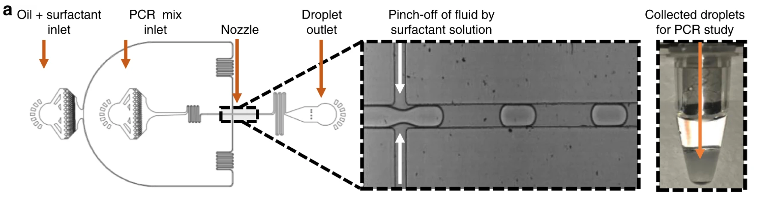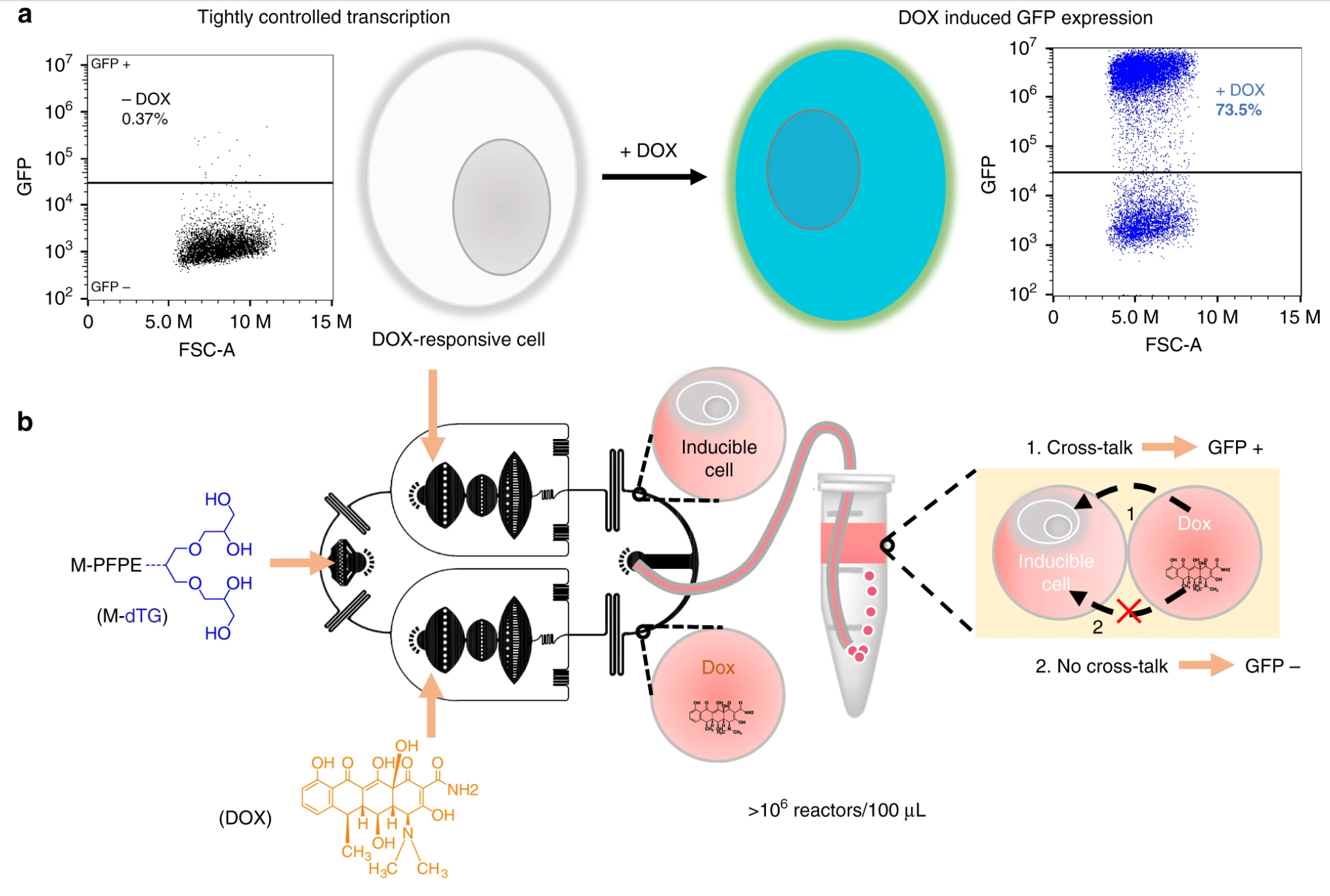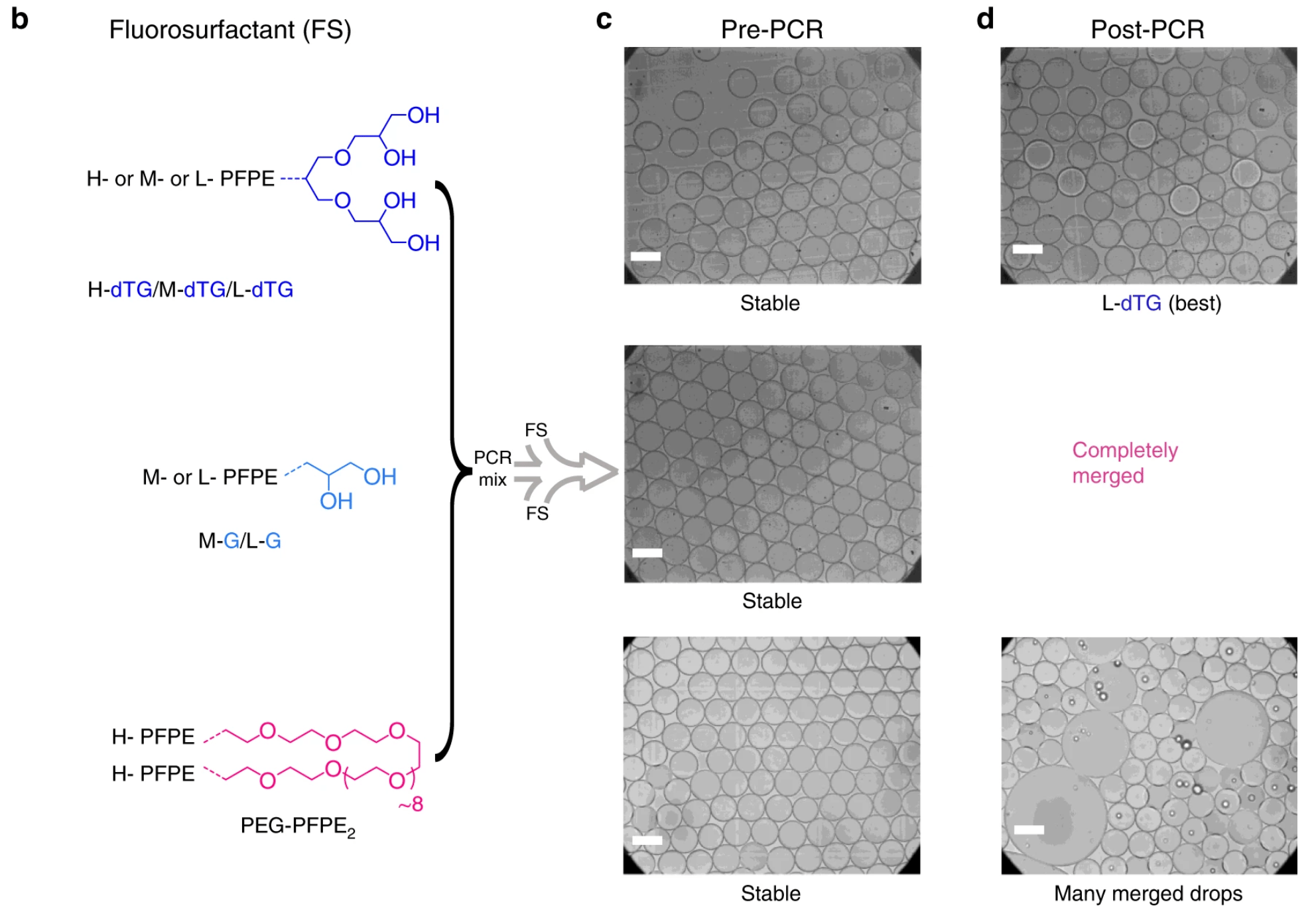 Fluorosurfactant-stabilized microfluidic droplets are widely used as pico- to nanoliter volume reactors in chemistry and biology. However, current surfactants cannot completely prevent the inter-droplet transfer of small organic molecules encapsulated or produced inside the droplets. In addition, the microdroplets typically coalesce at temperatures higher than 80 °C. Therefore, the use of droplet-based platforms for ultrahigh-throughput combination drug screening and polymerase chain reaction (PCR)-based rare mutation detection has been limited. Here, we provide insights into designing surfactants that form robust microdroplets with improved stability and resistance to inter-droplet transfer. We used a panel of dendritic oligo-glycerol-based surfactants to demonstrate that a high degree of inter-and intramolecular hydrogen bonding, as well as the dendritic architecture, contribute to high droplet stability in PCR thermal cycling and minimize the inter-droplet transfer of the water-soluble fluorescent dye sodium fluorescein salt and the drug doxycycline. (Dendronized fluorosurfactant for highly stable water-in-fluorinated oil emulsions with minimal inter-droplet transfer of small molecules. Nat Commun 10, 4546 (2019). https://doi.org/10.1038/s41467-019-12462-5)