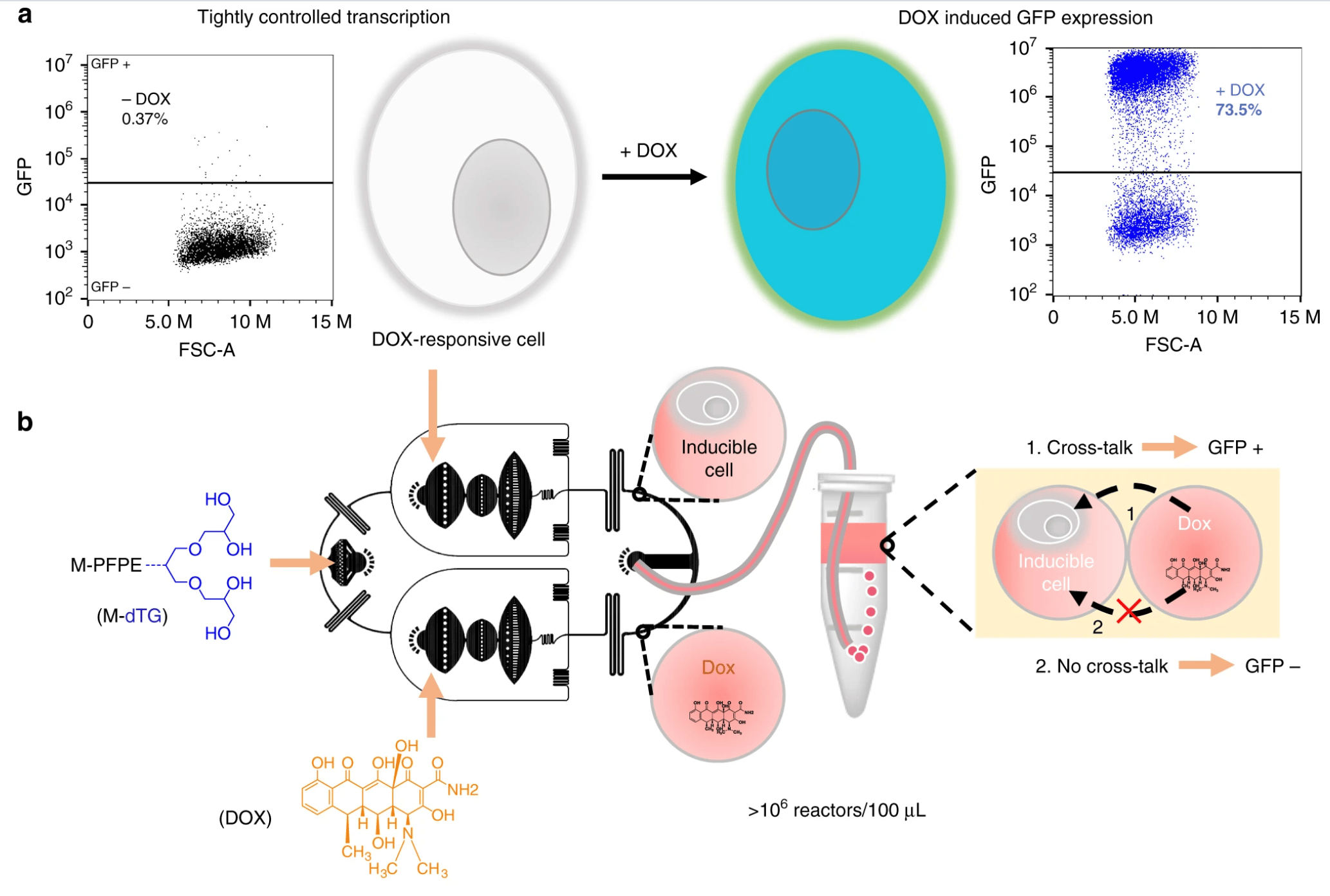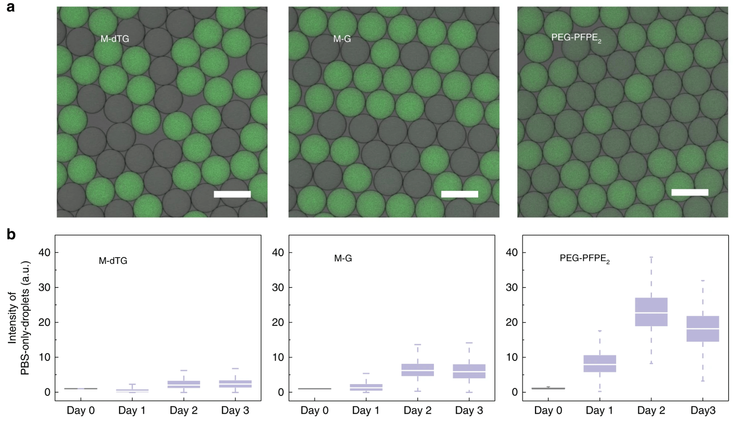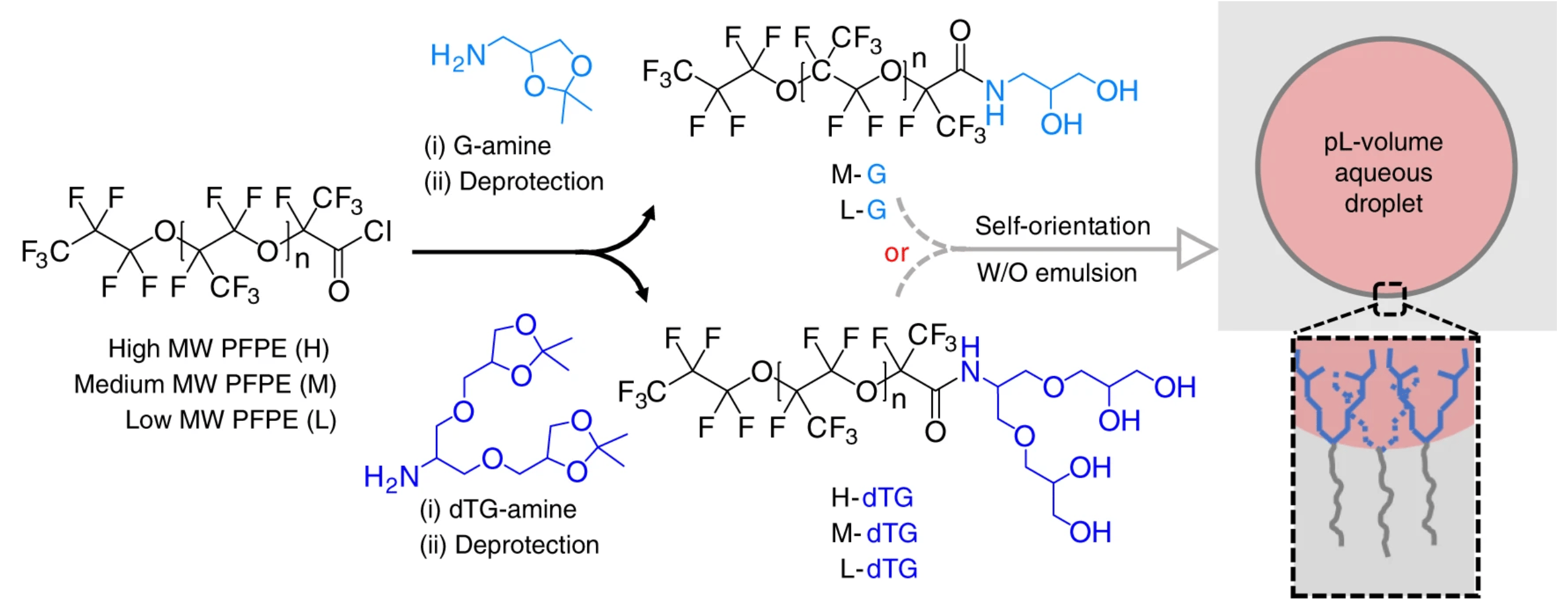 Fluorosurfactant-stabilized microfluidic droplets are widely used as pico- to nanoliter volume reactors in chemistry and biology. However, current surfactants cannot completely prevent the inter-droplet transfer of small organic molecules encapsulated or produced inside the droplets. In addition, the microdroplets typically coalesce at temperatures higher than 80 °C. Therefore, the use of droplet-based platforms for ultrahigh-throughput combination drug screening and polymerase chain reaction (PCR)-based rare mutation detection has been limited. Here, we provide insights into designing surfactants that form robust microdroplets with improved stability and resistance to inter-droplet transfer. We used a panel of dendritic oligo-glycerol-based surfactants to demonstrate that a high degree of inter-and intramolecular hydrogen bonding, as well as the dendritic architecture, contribute to high droplet stability in PCR thermal cycling and minimize the inter-droplet transfer of the water-soluble fluorescent dye sodium fluorescein salt and the drug doxycycline. (Dendronized fluorosurfactant for highly stable water-in-fluorinated oil emulsions with minimal inter-droplet transfer of small molecules. Nat Commun 10, 4546 (2019). https://doi.org/10.1038/s41467-019-12462-5)