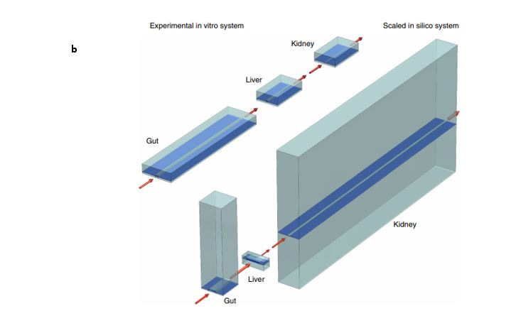 The lung and gut chips in the Ingber and colleagues’ system comprise a multi-compartment configuration (Fig. 1a), first described in the earlier lung-on-a-chip report [6], that generates stretching motions mimicking the lungs’ breathing motions during respiratory cycles (in the lung chip) or gut peristalsis (in the gut chip). Critically, the tissue chips include an endothelialized barrier, which plays a central role in drug transport, and an arteriovenous reservoir that serves the role of the system’s ‘systemic circulation’. A common media flowing through the reservoir and the various vascular-like endothelial barriers within each organ tissue acts as a blood substitute. The robotic system (Fig. 1a, right) addresses the multi-organ system as described in the caption; this schematic illustrates the gut-liver-reservoir-kidney configuration used to evaluate PK of orally delivered nicotine. The automated system, which is designed for frequent and convenient sampling of media at various locations in the circuit of linked chips, comprises a peristaltic pump driving an automated liquid handling system and mounted on a three-axis stage. The instrument, known as the Interrogator, includes a robotically-controlled microscope for the real-time, high-resolution monitoring of the progression of the tissue models, phase-contrast imaging, and epifluorescence. In situ imaging of the tissue chips complements off-line biochemical and mass spectrometric measurements of analytes such as drug concentrations. Computational models complementing tracer studies confirmed that the system can be used to mimic various aspects of drug adsorption and distribution, and a computational scaling model for the actual and scaled interconnected array of organ models (Fig. 1b) provided pharmacokinetic and pharmacodynamic information that can be directly correlated with clinical observations.