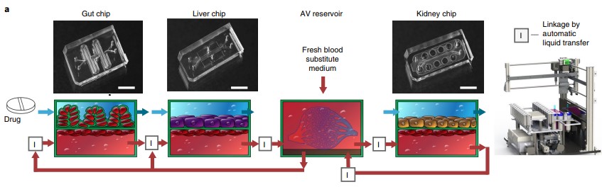 Recent interest has been rekindled toward the development of integrated multi-organ systems, particularly by federal agencies in the United States keen to develop tools that can be used for rapid testing to inform responses to biological threats, such as bioterrorism or viral pandemics. In 2012 the Defense Advanced Research Projects Agency (DARPA) and the NIH National Center for the Advancement of Translational Sciences (NCATS) launched the Microphysiological Systems (MPS) program. As is often the case with DARPA, the agency set a technologically extremely ambitious and disruptive goal: to produce a system comprising ten interconnected organ models that could operate for up to four weeks and evaluate drug safety and efficacy using human cells. Beyond the ongoing challenge of validating microengineered tissue systems comprising cultured human cells against model compounds for which responses are well established, the DARPA-NCATS program compelled investigators in a new direction. This new challenge was to create new platforms and analytical frameworks to capture systemic aspects of human physiology, addressing challenges such as organ scaling, the use of common media, and the establishment of dynamic control over fluid levels across the multiple elements of a complex microphysiological system. In two contributions in Nature Biomedical Engineering, Donald Ingber and colleagues now report a robotic system that links up to 10 tissue models in a circuit capable of recapitulating physiologically-based pharmacokinetics [11], and the use of the system to accurately predict the pharmacokinetics of orally administered nicotine and intravenously administered cisplatin in humans [12].