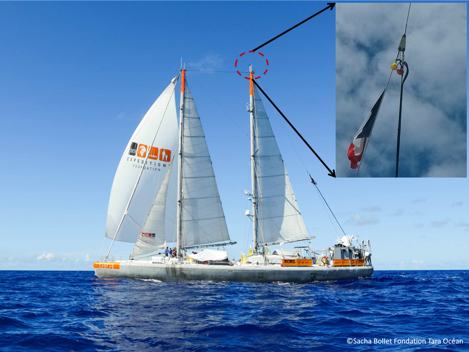 We joined the Tara Pacific expedition, as the first atmospheric aerosol team to ever participate in a Tara project, with the intention to explore the interplay between marine ecology and air-sea fluxes. For that purpose, we placed a “floating laboratory” in the form of a permanent atmospheric measurement system on the schooner, to measure the morphology, size distribution, biological content, and chemical composition of the atmospheric aerosol throughout the route of the Tara expedition. We positioned the aerosol inlet high up on the mast, to avoid any pollution from the schooner itself.