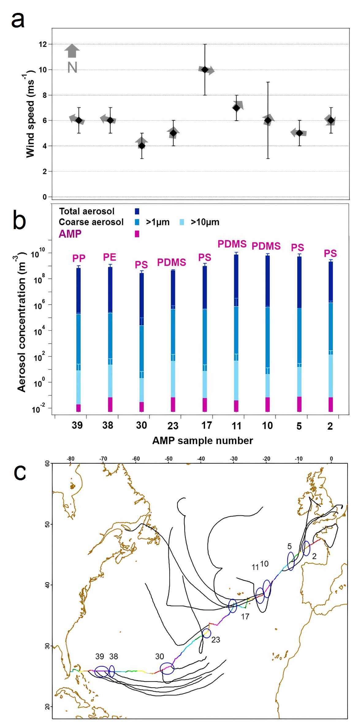 Airborne microplastics and total aerosol concentrations related to wind and air mass back trajectories. Panel a: Average wind speed and direction Panel b: Airborne microplastic and total and coarse mode aerosol concentrations per m3 for each sample. Panel c: Map of 48 hr HYSPLIT back trajectory ensembles for each point along the R/V Tara transect in the Atlantic Ocean where airborne microplasic were detected.