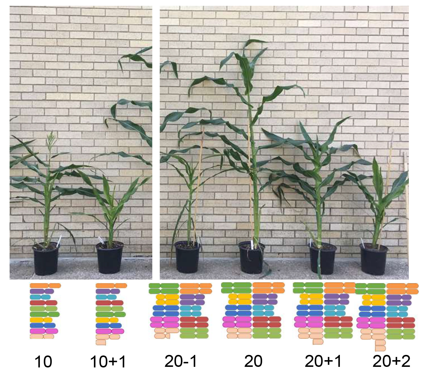 Photo of maize with increased or decreased dosage of chromosome segments (number of chromosomes:10+1; 20-1; 20+1; 20+2) versus haploid that loses a set of chromosomes (number of chromosomes: 10) relative to the diploid control (number of chromosomes: 20).