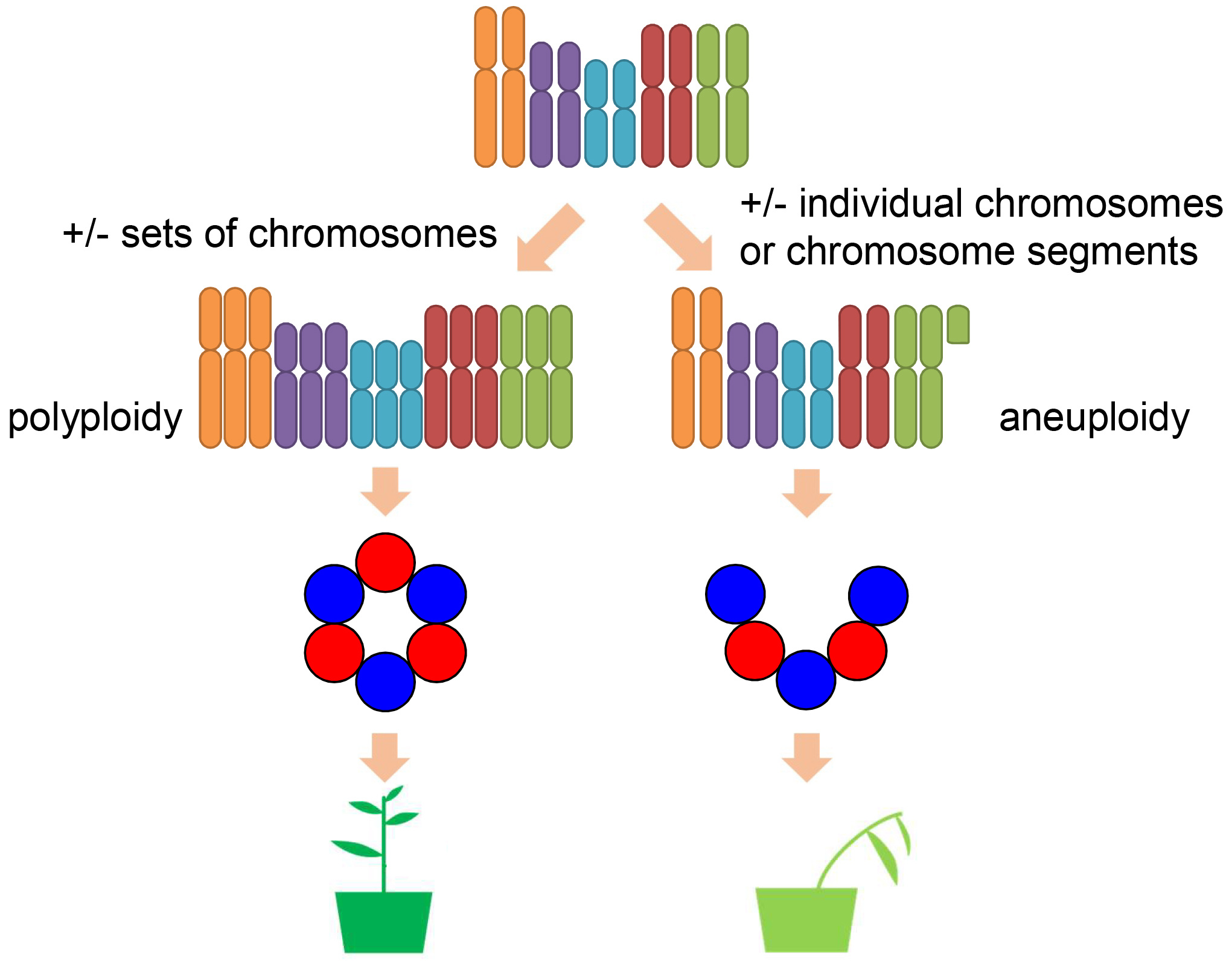 In living organisms, the genome consists of long molecules of DNA called chromosomes. Changes in the number of chromosomes may cause serious problems with growth, development, and function of an organism. There are two basic types of abnormality of chromosome numbers. One is changing the number of individual chromosomes or chromosomal segments (aneuploidy). One famous example, in this case, would be Down Syndrome, one of the most common human aneuploid conditions due to changes in the number of chromosome 21. The other is altering the number of whole sets of chromosomes (polyploidy).