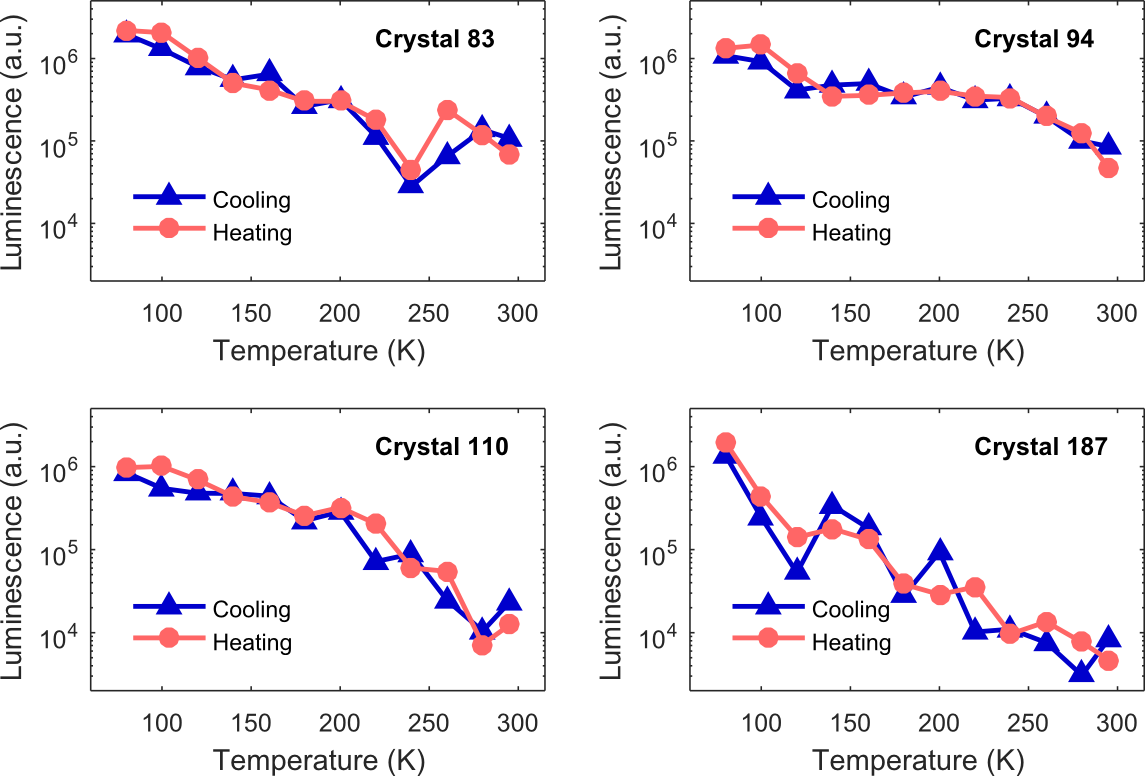 Surprisingly, the crystals revealed very individual blinking characteristics, leading to a high variety of slopes in their temperature dependent luminescence yield (see plots and movies below). Only averaging over a large number of crystals resulted in a trend of the luminescence yield similar to that observed in spatially integrated experiments. We attribute this diverse behavior in different crystals to the strong influence of individual defects, which, however, became less pronounced upon cooling, because their quenching efficiency reduced, as we observed directly in a reduction of the relative blinking amplitudes.