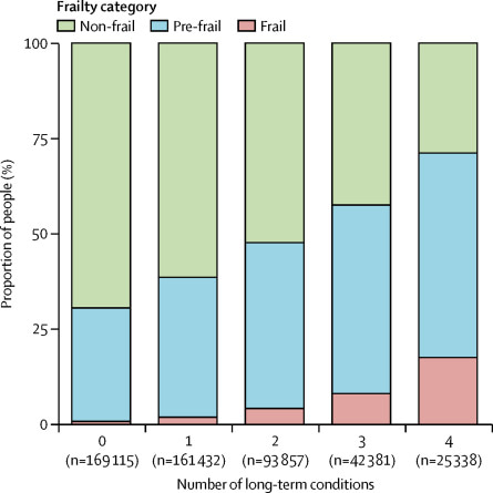Figure taken from Hanlon et al, Frailty and pre-frailty in middle-aged and older adults and its association with multimorbidity and mortality: a prospective analysis of 493 737 UK Biobank participants, Lancet Public Health, 2018.