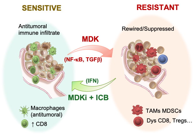 Histopathological studies of patient biopsies also showed an enrichment of tumor-associated macrophages in cases with high MDK levels. We then dissected the mode of action of MDK, finding that this protein exerts autocrine and paracrine effects in melanoma cells, ultimately resulting in an immune suppressive secretome (involving NF-kB and TGFβ signaling) that alters macrophage function and ultimately promotes cytotoxic CD8T cell dysfunction. Hence, we uncovered a new role of MDK in generating immunologically infiltrated, but otherwise tolerant backgrounds. From a therapeutic perspective, we found that inhibiting MDK restores sensitivity to immune checkpoint blockers in clinical trials. Furthermore, we found an MDK-associated gene set associated with resistance to immunotherapy in several cohorts of patients (Figure 1). Our data, therefore, has important implications at two levels: first, in our understanding of how melanomas can rewire the immune system, and secondly, provides the proof of principle for MDK inhibition as a strategy to improve the efficacy of immune therapies in clinical testing. Importantly, our findings described here for MDK are not restricted to melanoma. We also found immunomodulatory features of MDK in datasets from lung squamous cell carcinoma, glioma, and kidney renal clear cell carcinoma, thus broadening future applications of this protein in the oncology field.
