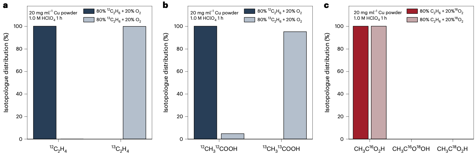 To elucidate the reaction intermediates and investigate the underlying mechanism, we conducted isotopic labeling experiments. Using 13C2H6 as the gas feed, we confirmed that ethane was indeed the carbon source for the products we observed. Interestingly, we found that no acetic acid is 18O-labeled when 18O2 was used, indicating that water, rather than gaseous O2 is the oxygen source for the oxygenates produced from ethane activation.