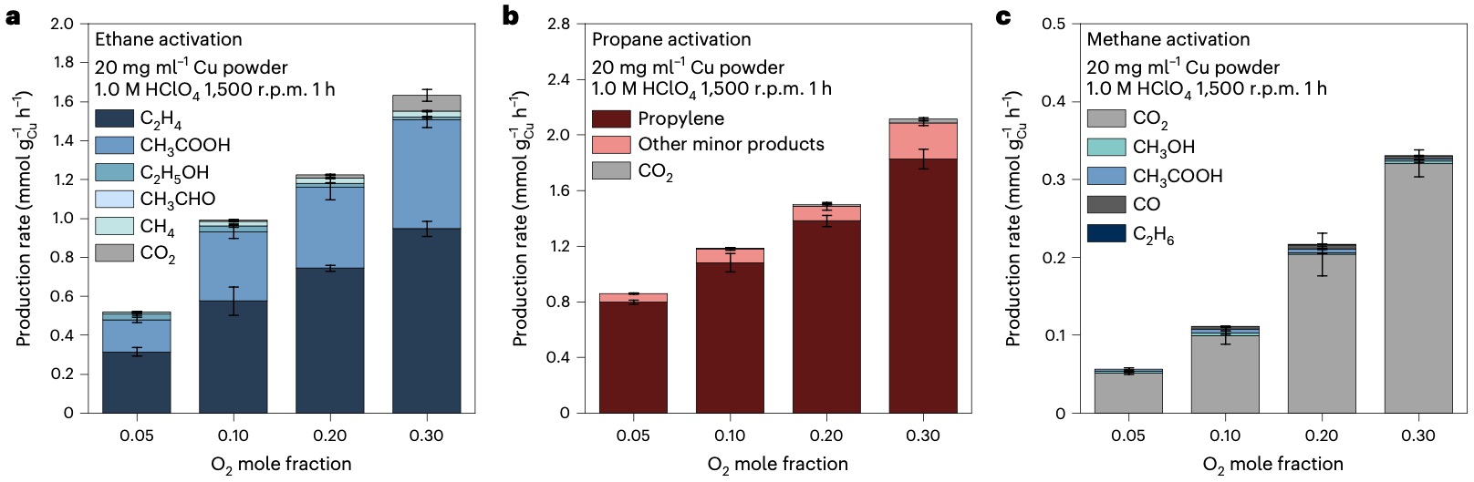 Ethane, under our mild aqueous conditions, was successfully converted into ethylene and acetic acid with an impressive conversion rate of 2.27 mmol·gCu−1·h−1 and a combined selectivity of up to 97%. Similarly, propane demonstrated high conversion rates of up to 1.83 mmol·gCu−1·h−1, yielding propylene with a selectivity of up to 94%. In the case of methane, the main products of activation were carbon dioxide, methanol, and acetic acid.