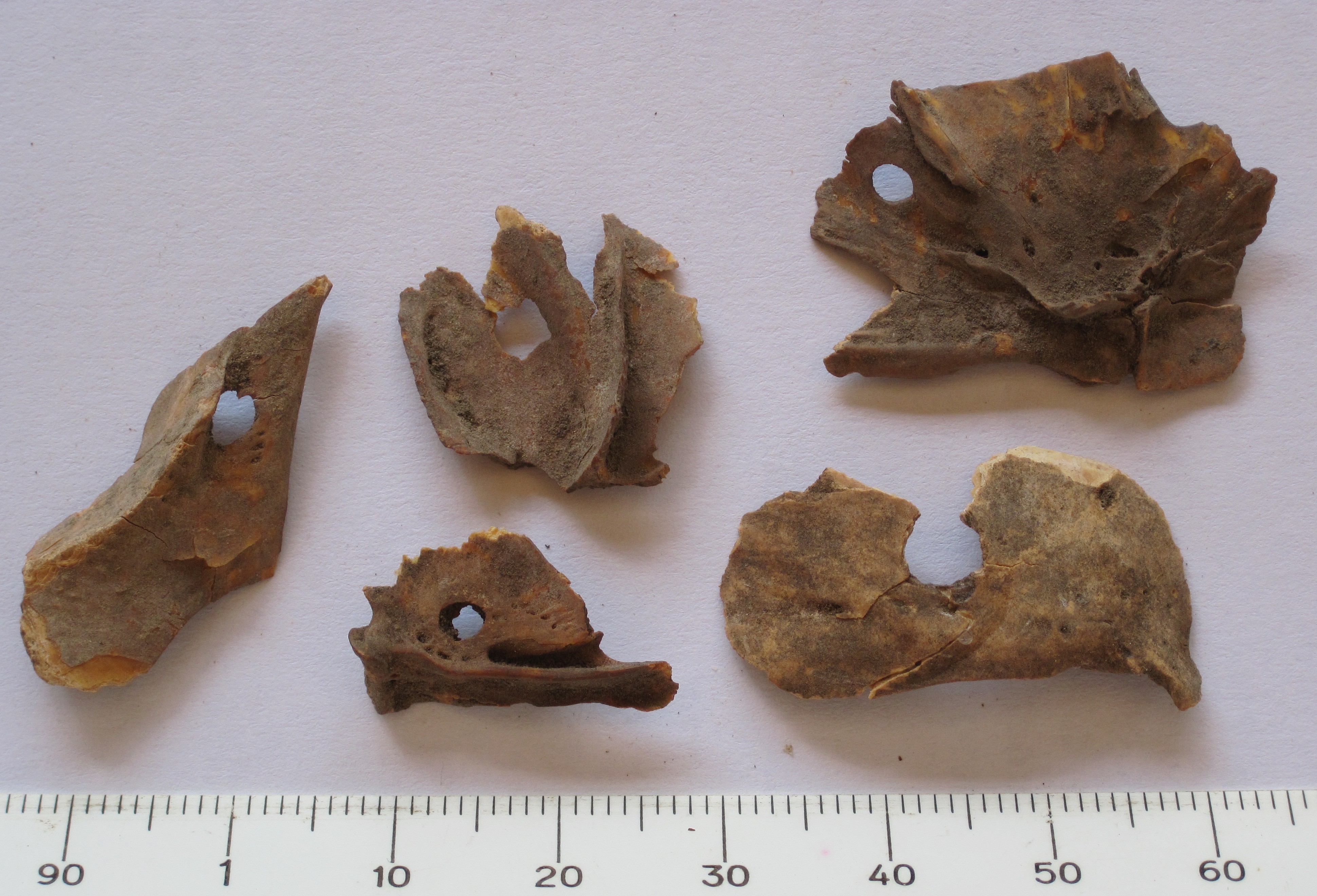 Neat circular perforations in some of the fish bones from Likoaeng are consistent with catching fish by spearing them using bone points, examples of which were found in the excavation. Basket traps and other techniques were probably also used (Photograph courtesy of Dr Ina Plug).