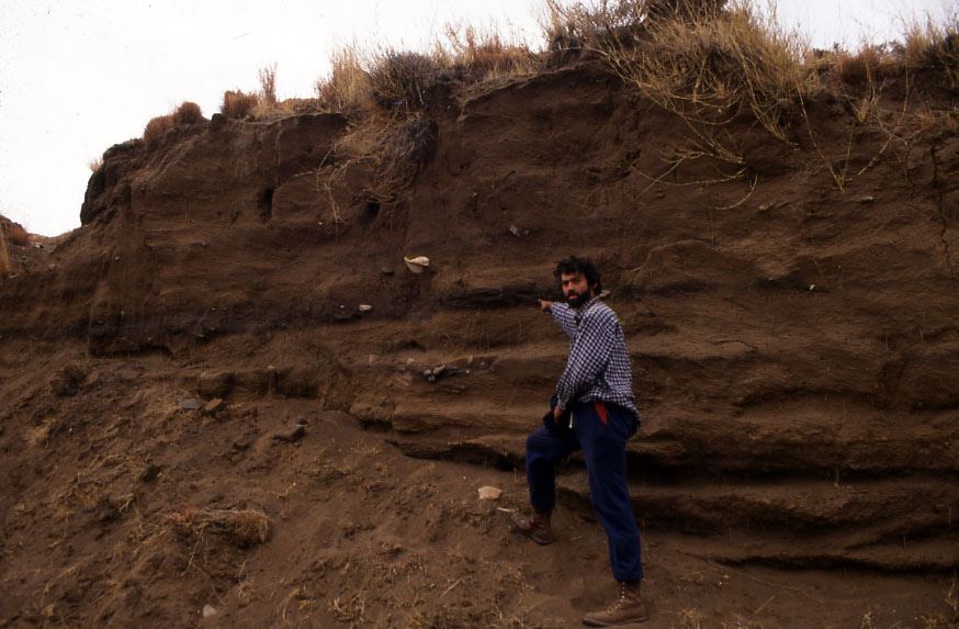 A very much younger version of myself pointing to the thickest of the dark, artefact- and bone-rich bands in a river-cut section through the Likoaeng site as it was when discovered in 1992.