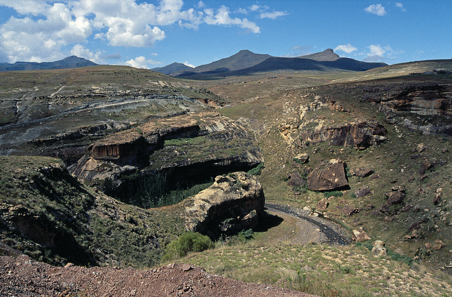 View of Sehonghong Shelter (at centre behind the projecting sandstone spur) from above. Excavations here show it to have been used intermittently by hunter-gatherers over the past 60,000 years, most recently in the late nineteenth century. Paintings, now poorly preserved, cover its rear wall.
