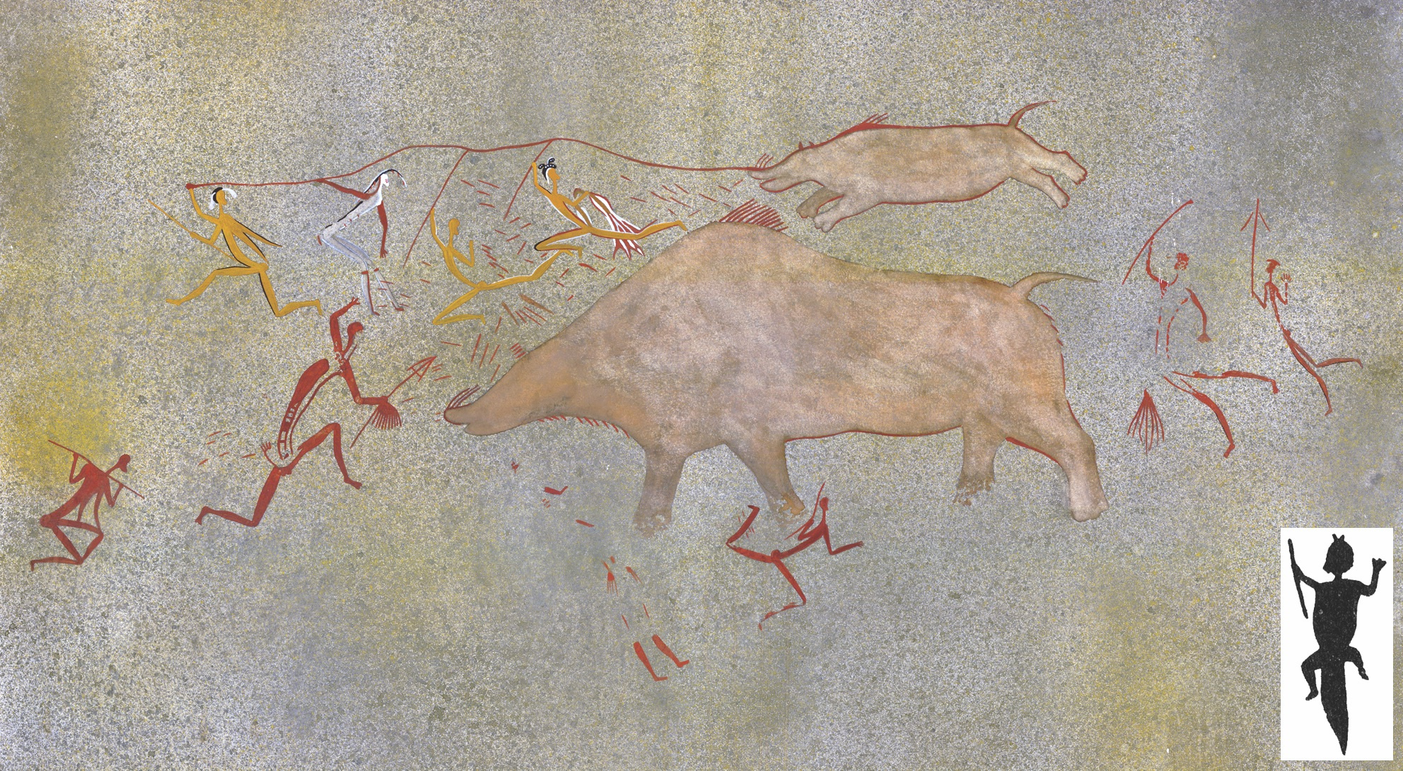 Tracing by the late Patricia Vinnicombe of an iconic painting at Sehonghong. The scene was interpreted in 1873 by Qing, a Bushman conversant with the cosmology and myths of the last Maloti hunter-gatherers. Most likely recording a shamanic vision rather than a 'real' event, it shows the capture and control of two rain-animals that are being led across the landscape to a place at which they will be killed so that their blood can fall and turn into rain (Courtesy Rock Art Research Institute, University of the Witwatersrand, South Africa).