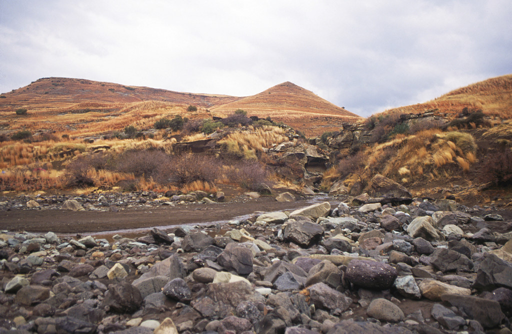 View from within the bed of the Senqu River into the Likoaeng stream. The archaeological site lies to the left behind the bushes.