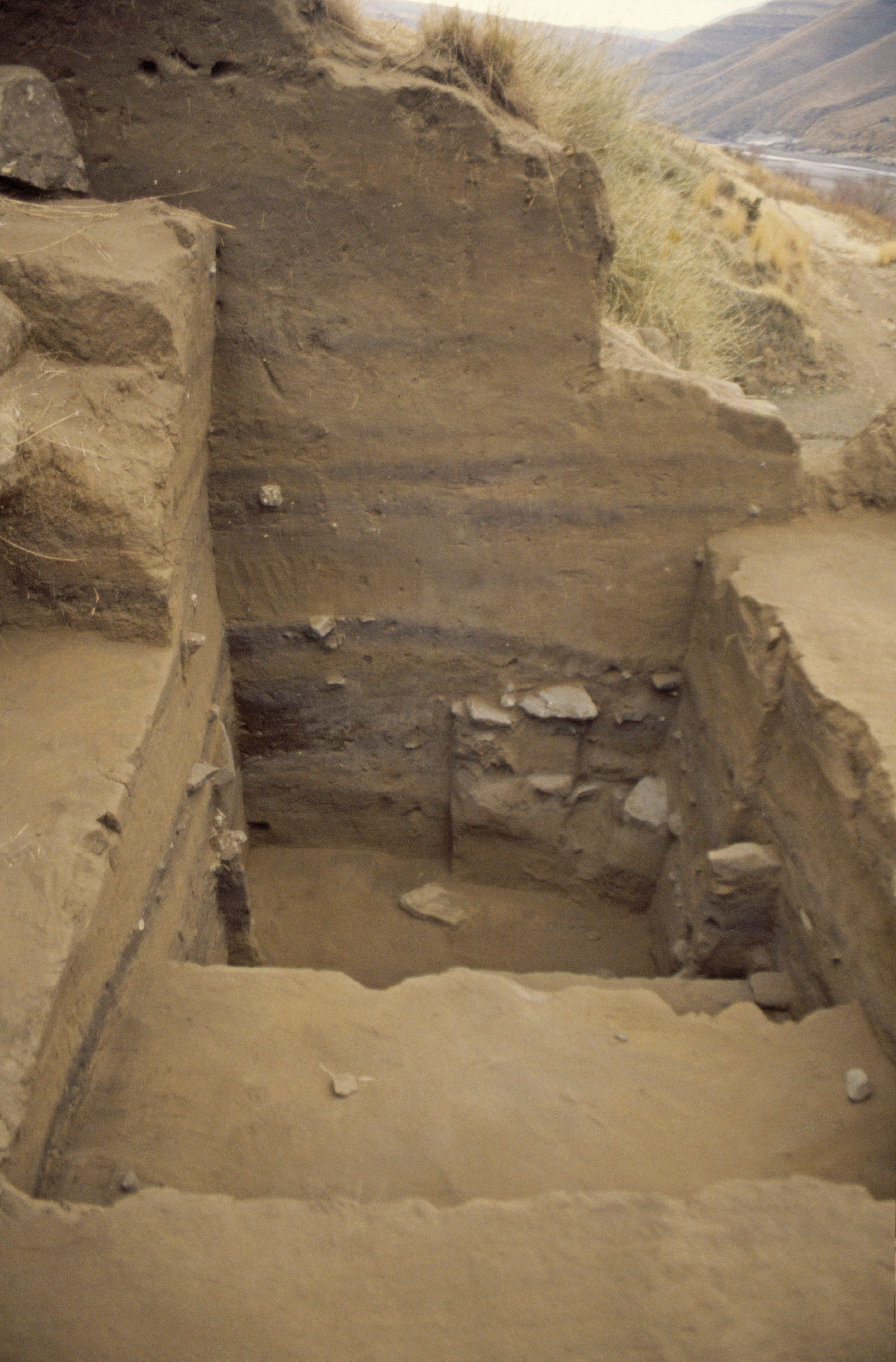 The north wall of the excavation trench at Likoaeng clearly shows how lower layers are more rock-rich and fall away down slope toward the river compared to the horizontal bedding of those above. The concealed entrance to a small rock-shelter lies immediately beyond the left frame of the photograph.