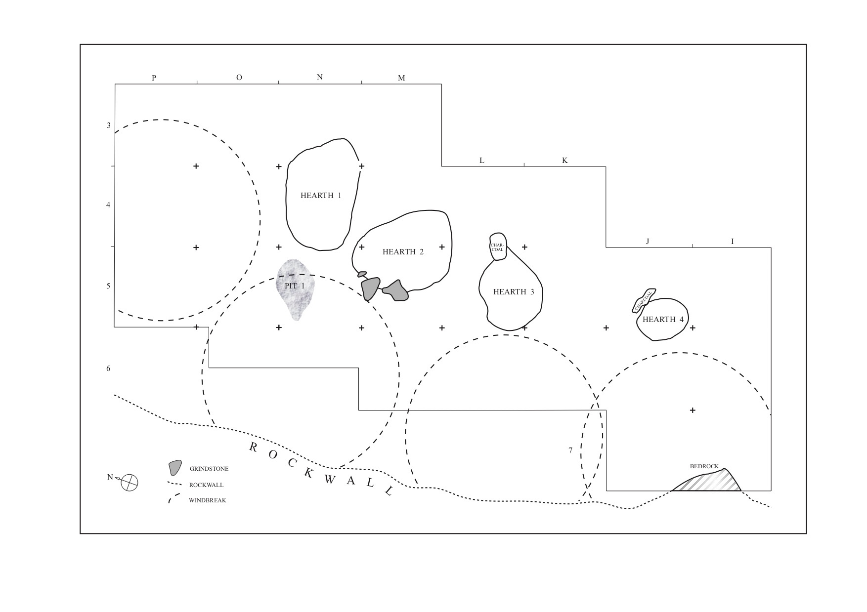 Reconstruction of the likely setting of four small shelters set behind individual hearths and backing up against the sandstone exposure at the rear of the Likoaeng site. The shelters lie parallel to and face toward the Senqu River. This reconstruction reflects the organisation of the site in Layer III, around the second/third centuries AD, but can also be detected in the immediately preceding occupations as well.