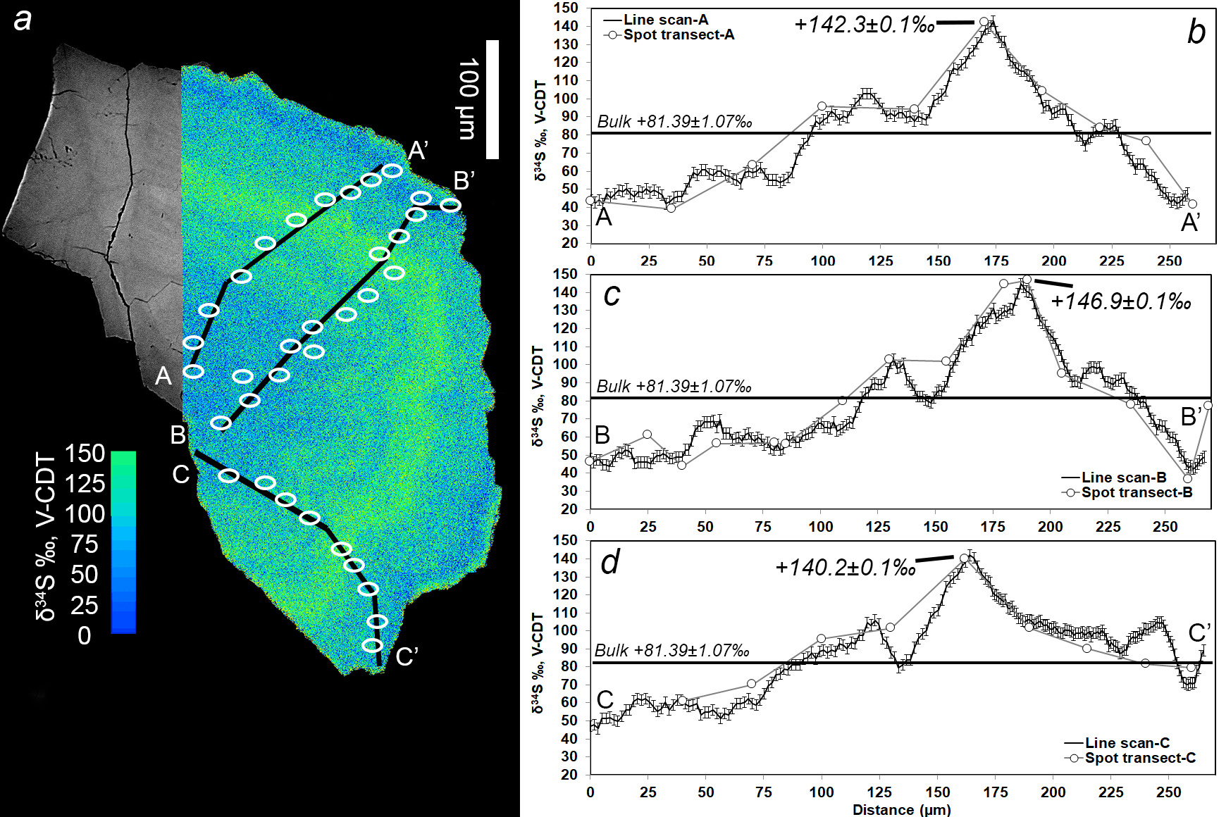Figure 4. Sulfur isotope variability in pyrite. (a) SEM image of a polished pyrite crystal from Kallmora, draped by a composite of eight SIMS ion imaging renderings, with three ion imaging line scans (A-A’, B-B’, C-C’) and corresponding analytical transects of 10 µm SIMS spots for δ34S. The color coding of the ion images is normalized and anchored to the SIMS spots. (b-d) transects of SIMS spots together with δ34S values from corresponding line scans in the ion images, and bulk δ34S of the sample. From Biosignatures of ancient microbial life are present across the igneous crust of the Fennoscandian shield” in Communications Earth & Environment.