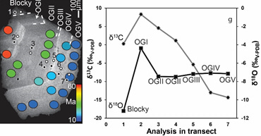 Figure 3. (left) SEM image of a calcite crystal with a nucleous of older blocky calcite followed by five overgrowth generations (OGI-V) with LA-ICP-MS U-Pb spots (color coded for age), and SIMS spots for δ13C and δ18O marked. (right) SIMS transect results. From Biosignatures of ancient microbial life are present across the igneous crust of the Fennoscandian shield” in Communications Earth & Environment.