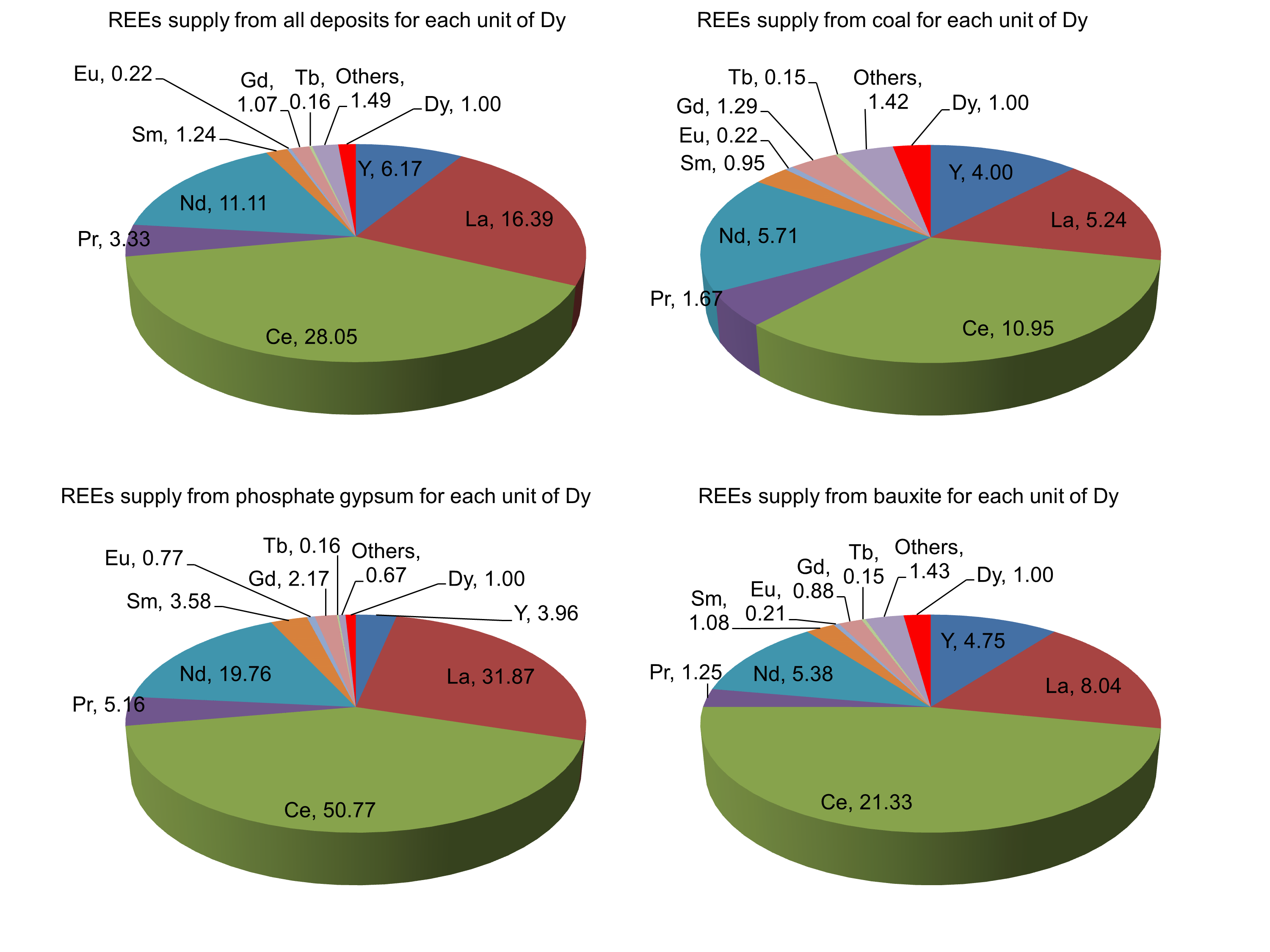 Fig. 2: Ratios of dysprosium production to other REEs production from coal, bauxite, phosphate gypsum and all traditional deposits
